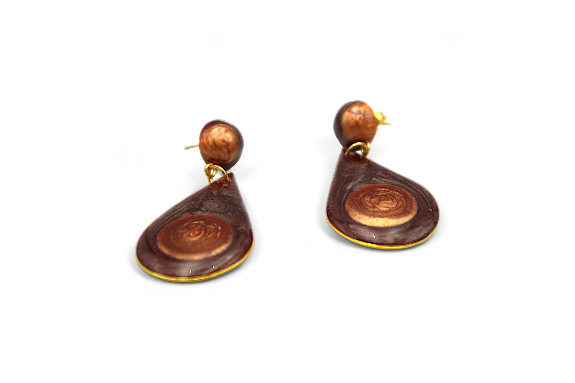 Ces boucles d'oreilles originales et élégantes sont composées d'un clou demi sphère en résine marron nacré et marron clair nacré, ainsi que d'un pendentif en forme de goutte d'eau en résine marron nacré avec un cercle en résine marron clair nacre. Elles mesurent 5,5 cm de longueur et le pendentif a une dimension de 3 cm sur 1,5 cm.