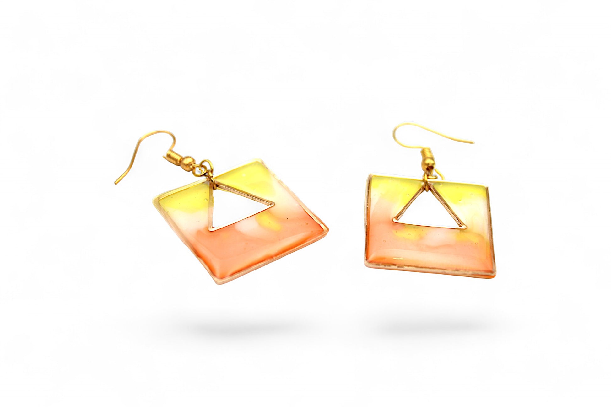 Optez pour un look tendance et coloré avec ces boucles d'oreilles en acier inoxydable doré agrémentées de pendants carré en résine jaune, blanc et orange. Le contraste entre le métal doré et les couleurs vives de la résine apportera une touche d'originalité à toutes vos tenues.