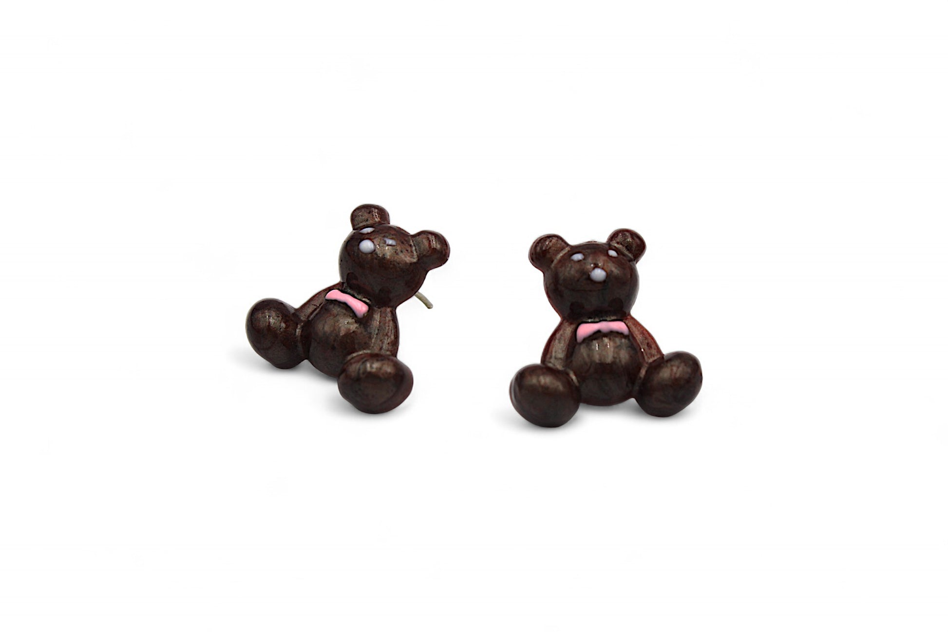 Adorable clou d'oreille en forme d'ourson de 2 cm en résine marron, monté sur une tige en acier inoxydable.