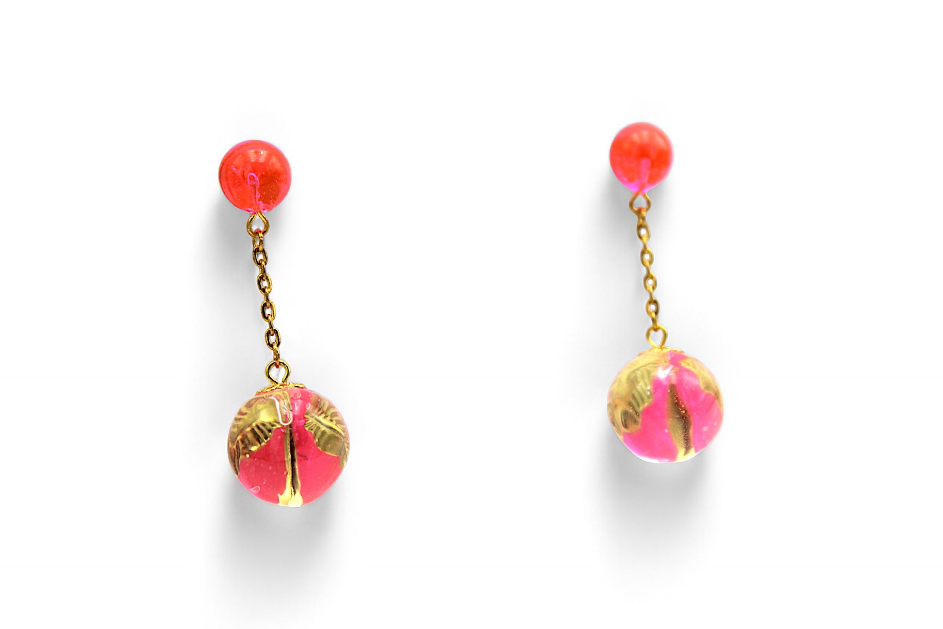 Ces boucles d'oreilles élégantes et originales sont composées d'un clou en acier inoxydable doré en forme de demi sphère en résine de couleur pêche, d'un pendentif , en forme de sphère en résine transparente et couleur pêche de 1,5 cm de diamètre contenant un palmier doré en inclusion.
