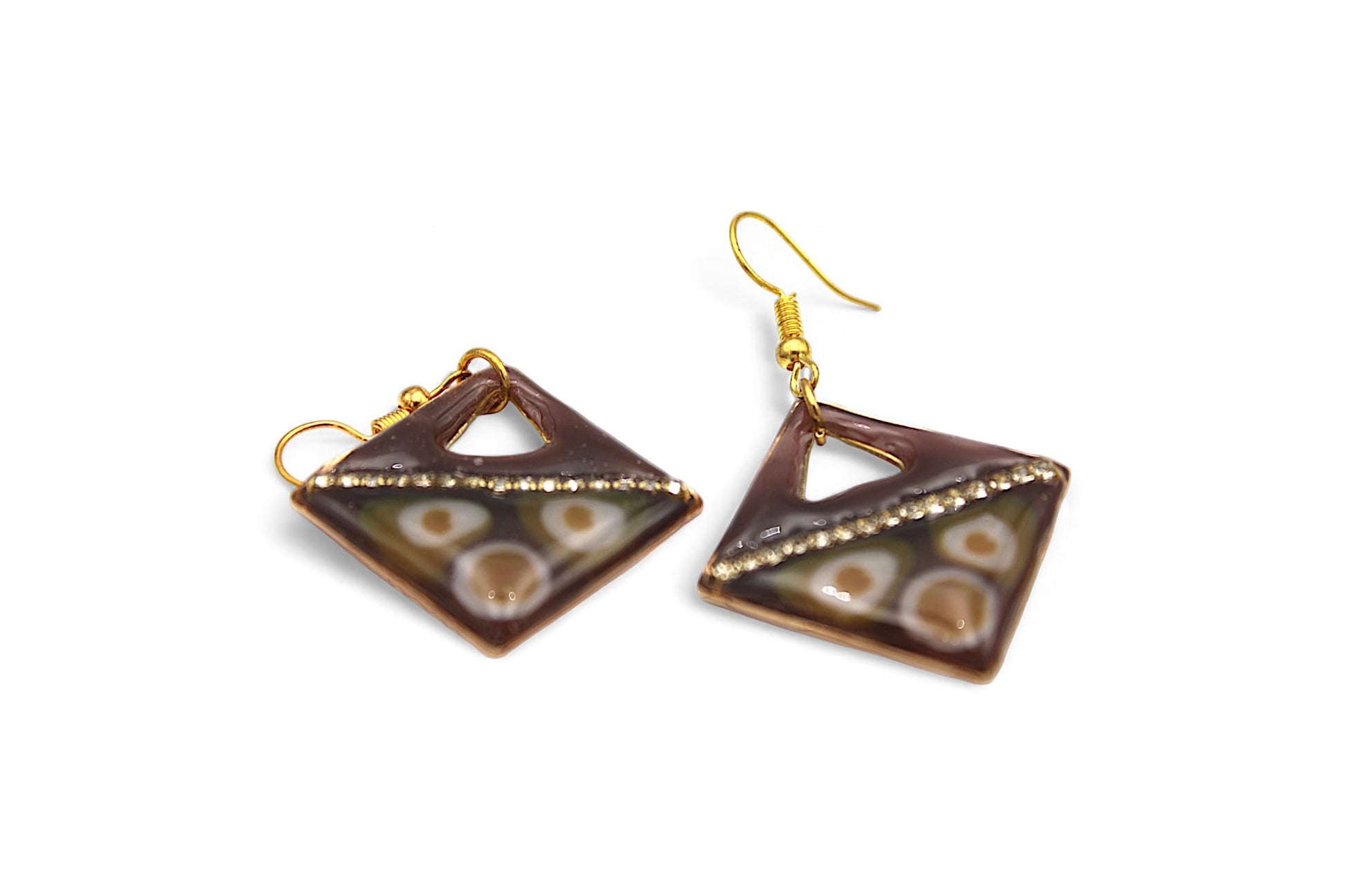 Ces magnifiques boucles d'oreilles pendantes sont composées d'un carré de résine marron et tâches blanches et caramel, orné d'une ligne de strass Swarovski dans sa diagonale. Elles apporteront une touche d'élégance et de sophistication à toutes vos tenues.