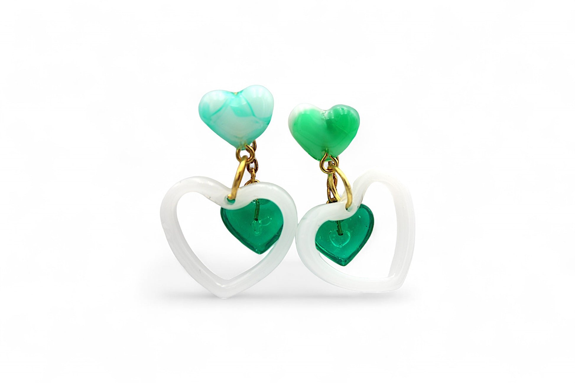 Boucles d'oreilles clou pendant, avec une association de cœurs en résine de couleur vert et blanc. Elles mesurent 3,5 cm de longueur et sont réalisées en acier inoxydable doré.