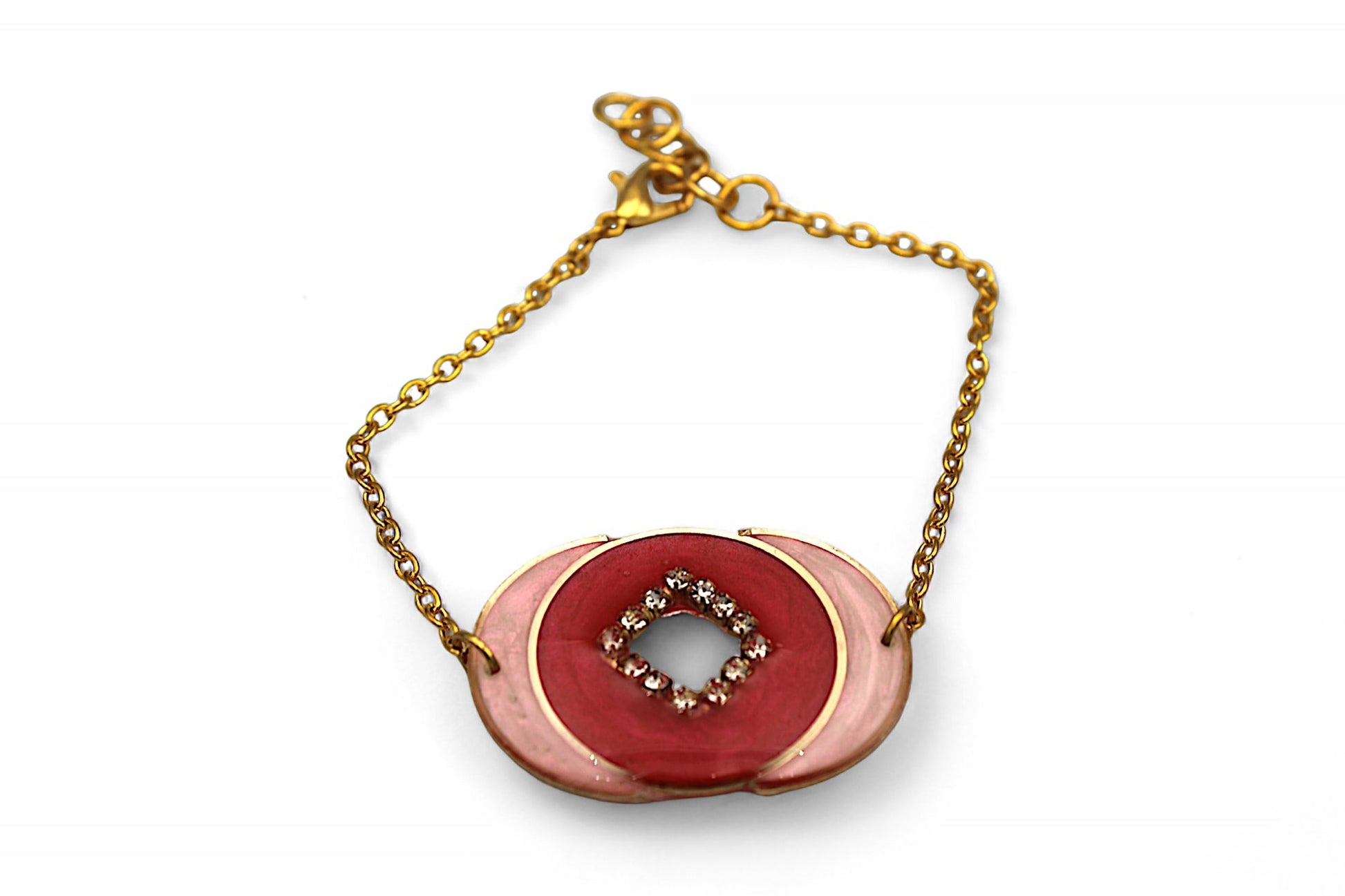 Bracelet en acier inoxydable doré avec un cercle en résine rouge et des strass Swarovski, orné de lunes blanc nacré pigmenté en rouge. La longueur du bracelet est ajustable de 15 cm à 18 cm et la longueur du cercle est de 2,5 cm.