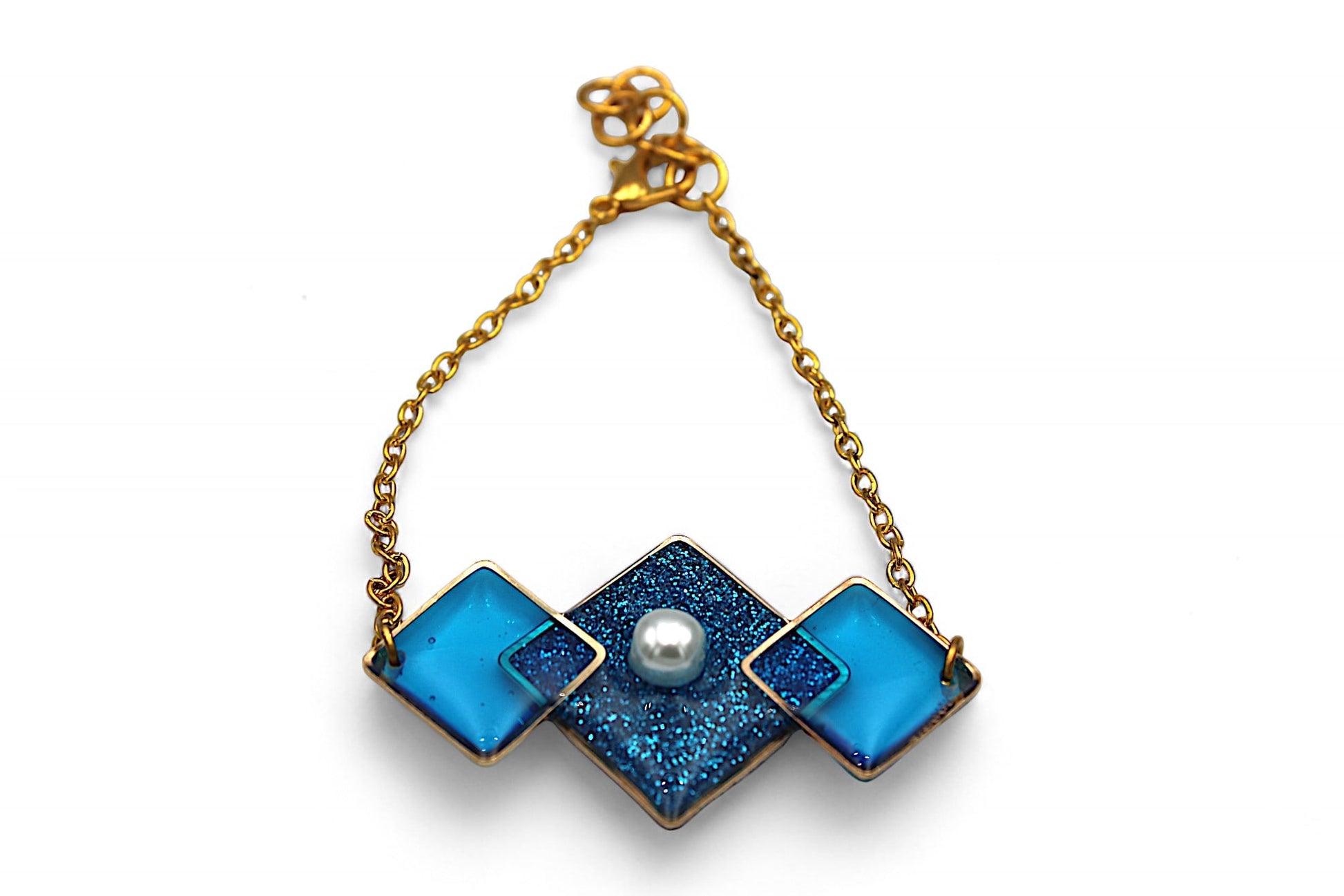 Ce bracelet élégant et raffiné est fabriqué en acier inoxydable doré avec une association de carré en résine bleue, perle blanche et paillettes bleues. Sa longueur est ajustable de 15 cm à 18 cm, idéale pour s'adapter à tous les poignets.