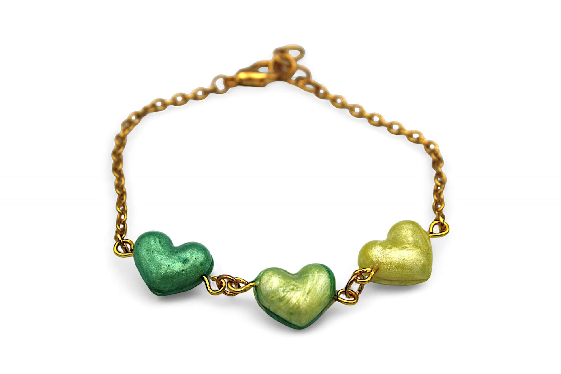 Ce bracelet en acier inoxydable doré est orné de cœurs en résine verts et jaunes métallisés. Sa longueur est ajustable de 15 cm à 18 cm, et les dimensions des cœurs sont de 1x1 cm.