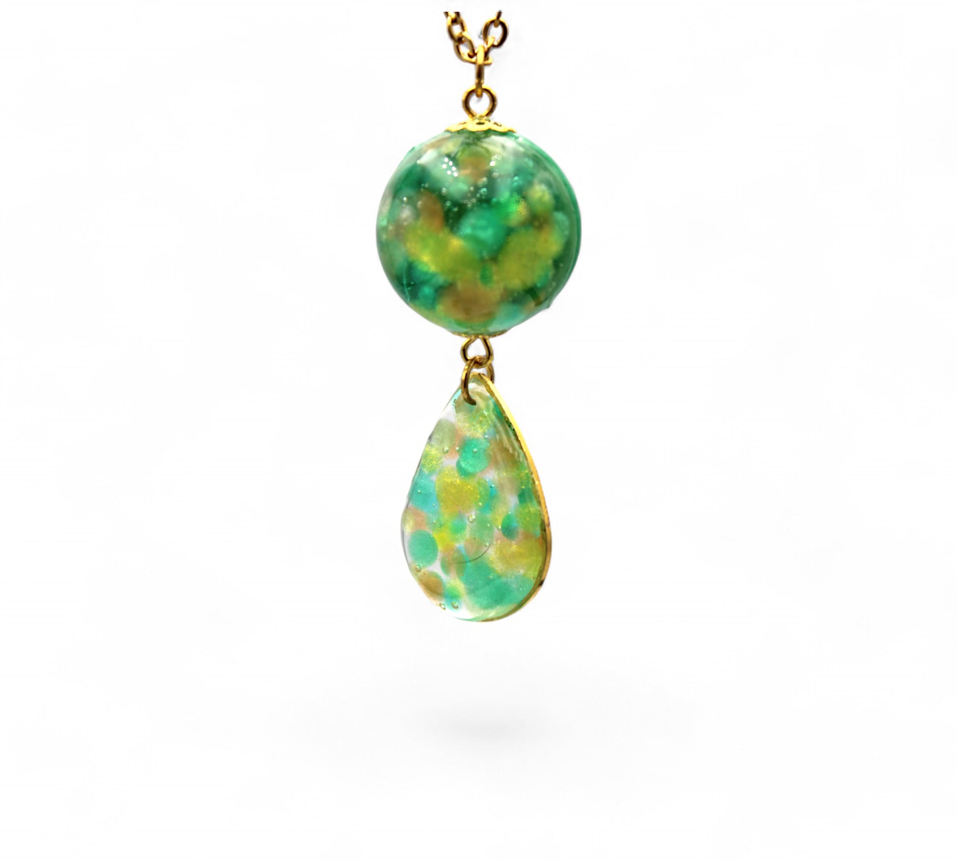 Pendentif en spherique de 2 cm de diamètre en bulles de résine dans les tons verts et orangés