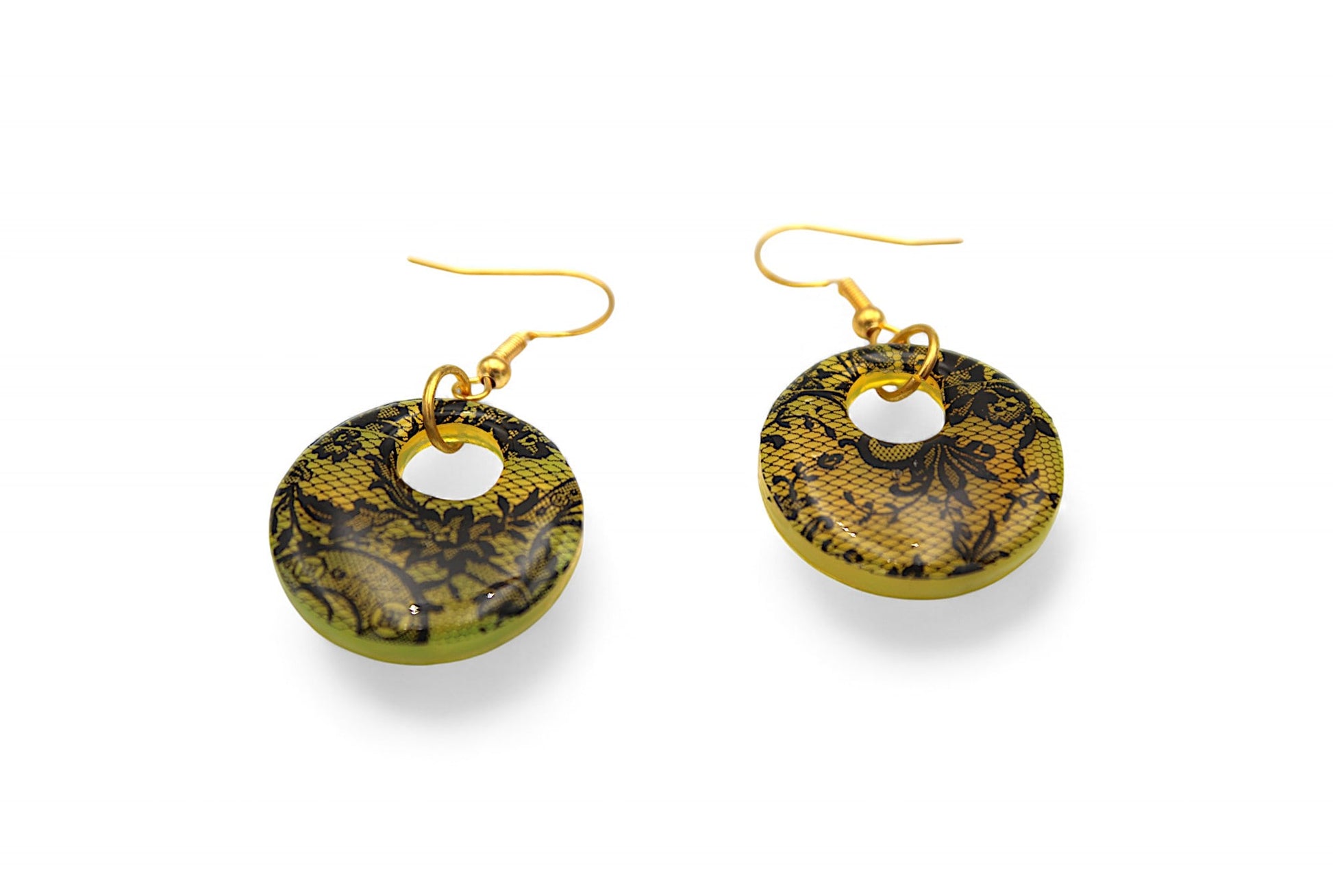 Pendentif : Cercle de 2,5 cm de diamètre en résine couleur mangue avec dentelle noire