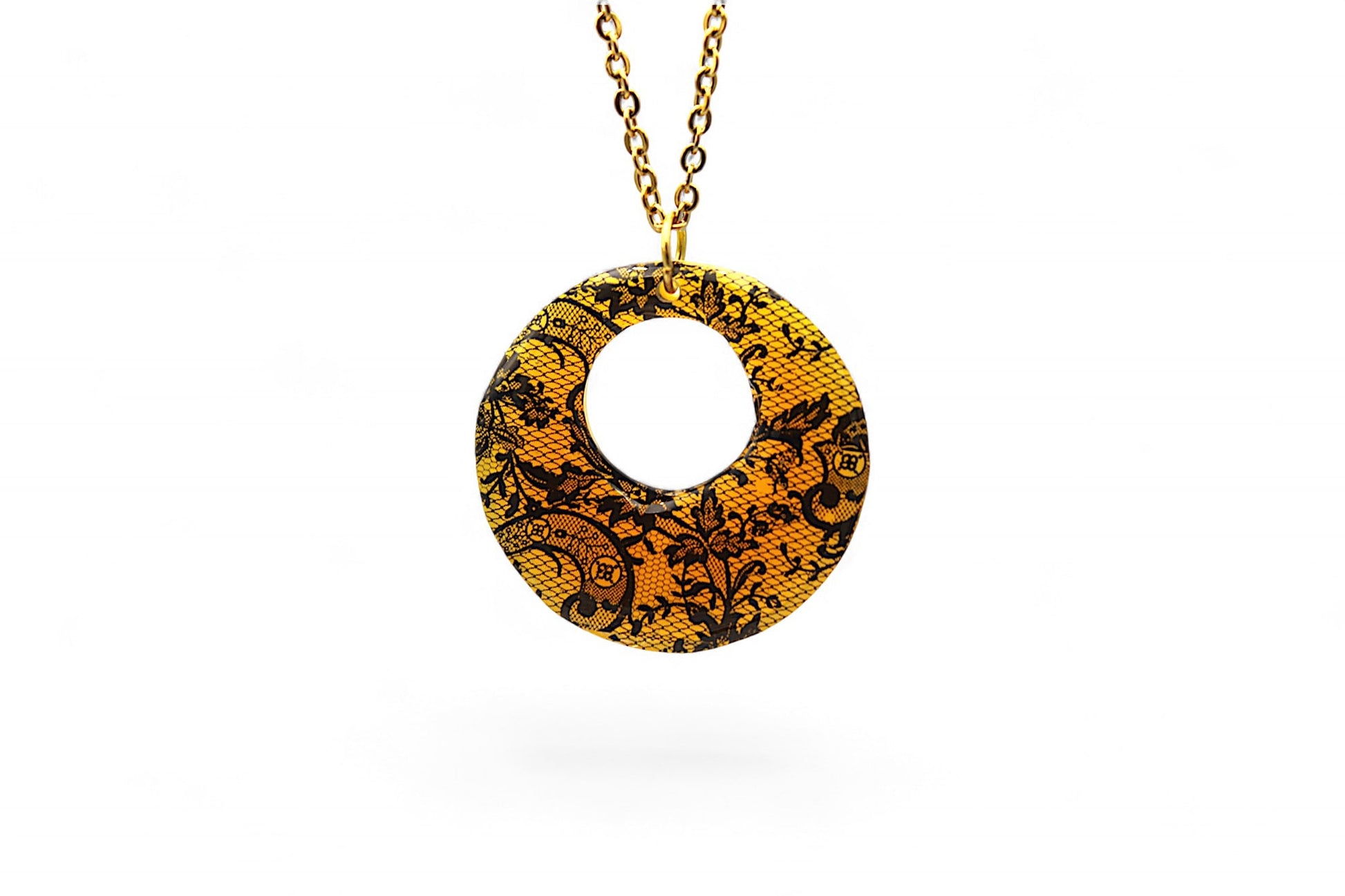 Pendentif : Cercle de 4 cm de diamètre en résine couleur mangue avec dentelle noire