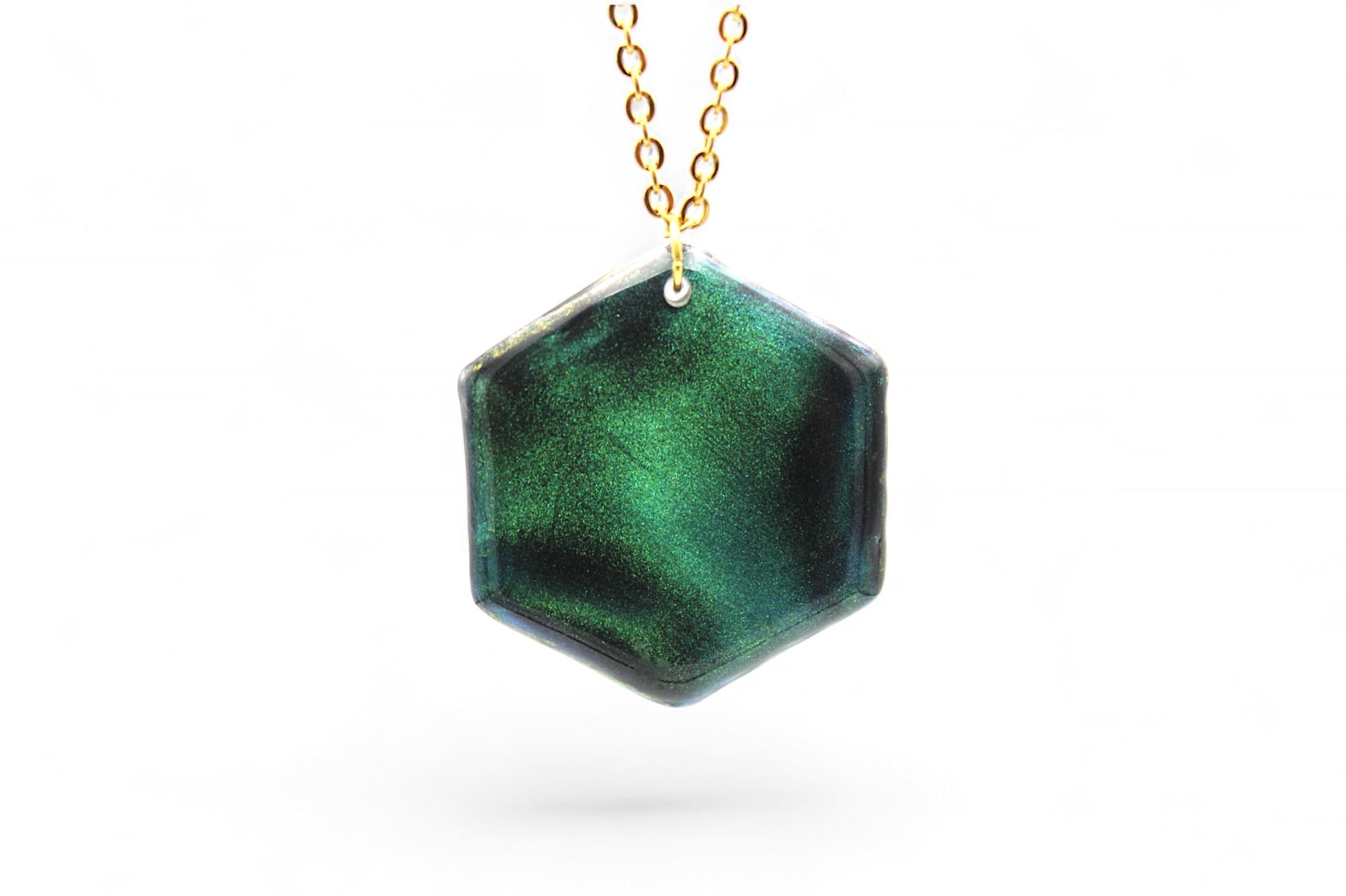 Design : Pendentif hexagonal avec résine noire métallisée (recto : orange/doré, verso : vert)