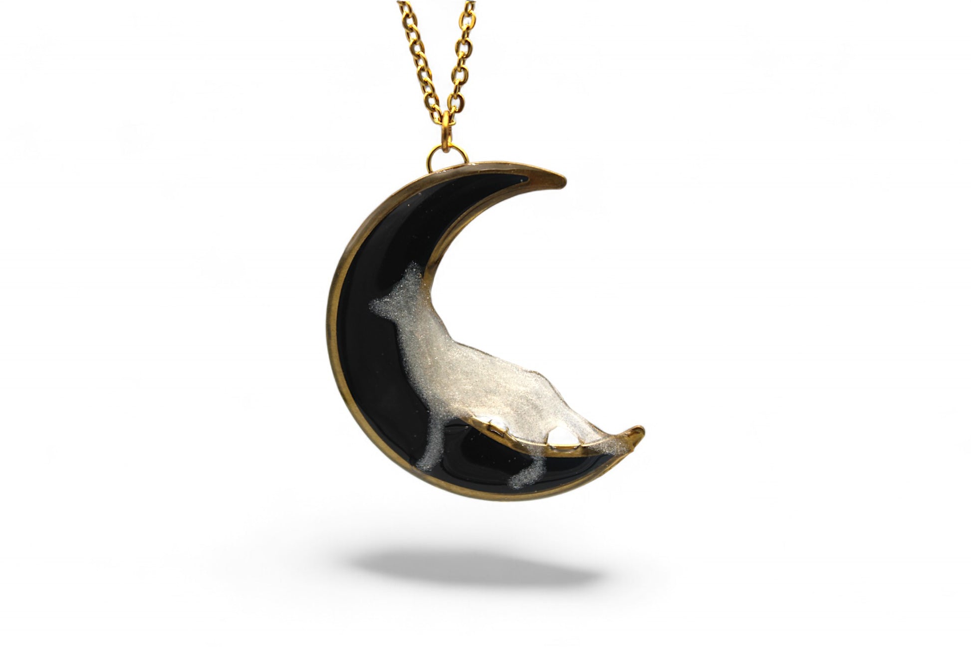 Pendentif : Lune en résine noire avec silhouette de Berger Blanc Suisse en résine blanc nacré