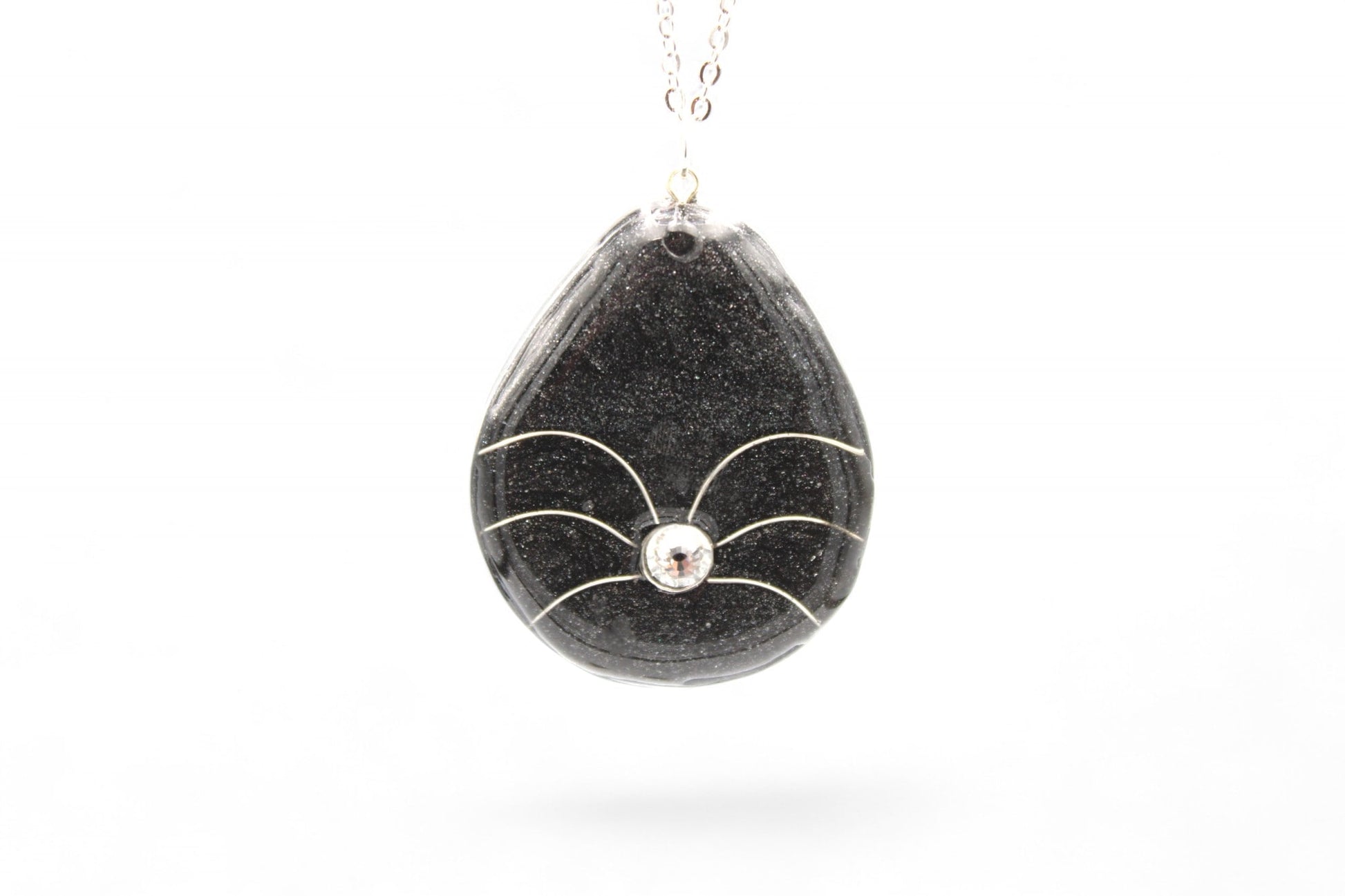 Matériaux : Acier inoxydable argenté, résine noire nacrée, fil argenté, strass Swarovski