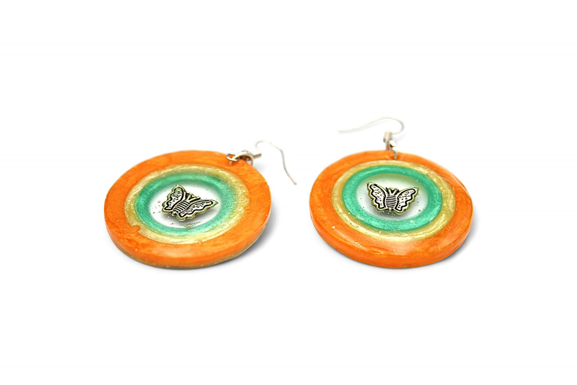 Ces boucles d'oreilles pendantes sont un véritable bijou de créativité et d'élégance. Composées d'un cercle de résine transparente avec une breloque papillon argenté à l'intérieur, elles sont entourées de trois cercles de résine vert nacré, jaune nacré et orange nacré. Leur design original et raffiné apportera une touche de couleur et de luminosité à votre tenue.