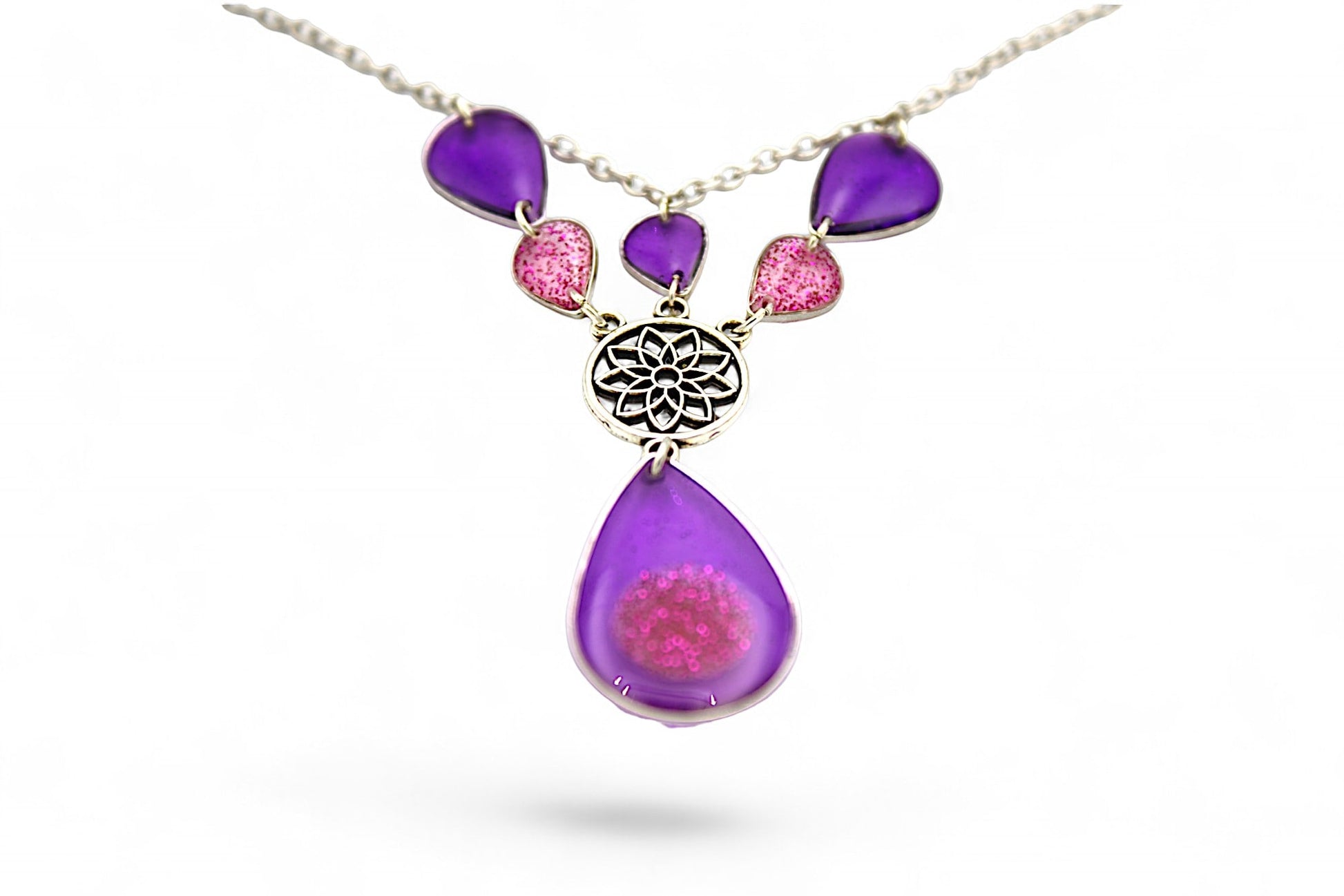 Ce collier en acier inoxydable argenté mesure 63 cm et est agrémenté d'un pendentif original en forme de goutte d'eau. Ce pendentif de 7 cm est composé d'une goutte d'eau en résine violette avec un cercle de paillettes roses, surmonté d'une breloque fleur de lotus et de gouttes d'eau de différentes tailles en résine violette et paillettes roses.