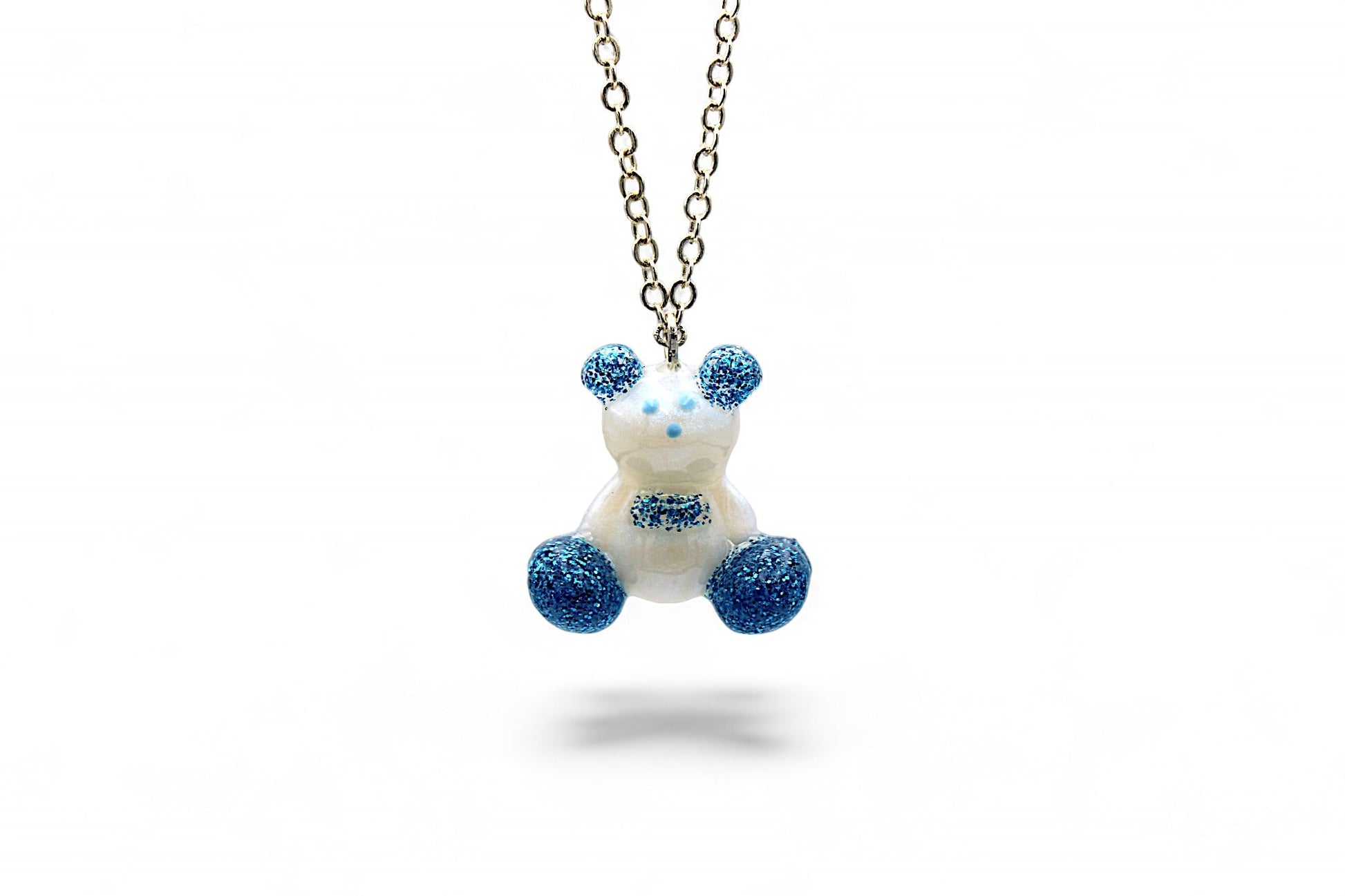 Ce collier original est composé d'une chaîne en acier inoxydable argenté de 54 cm de longueur, accompagnée d'un adorable ourson en résine blanc et paillettes bleues de 2 cm de taille.