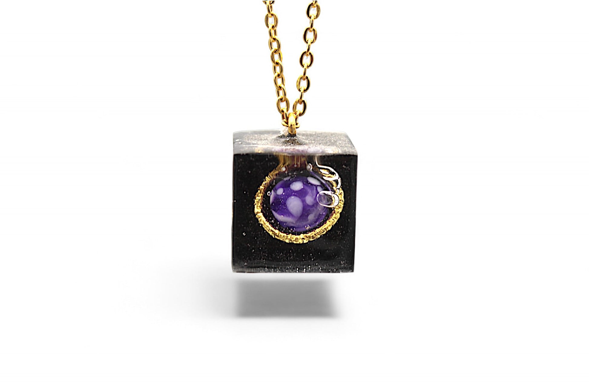 Collier en acier inoxydable doré avec un pendentif cube en résine noir et transparent, avec un insert boule violette et blanche. Effet cosmos.
