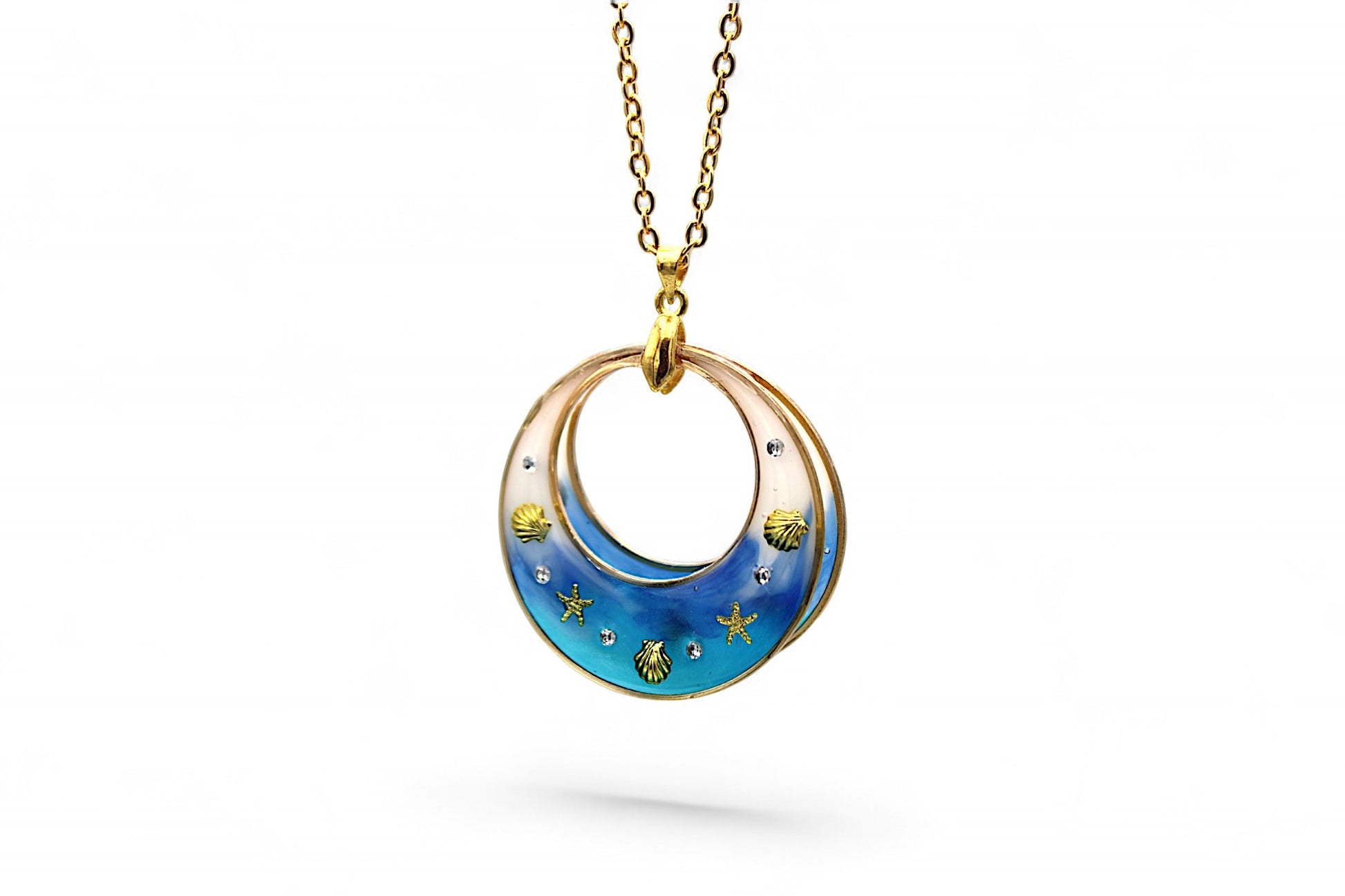 Ce collier en acier inoxydable doré de 56 cm est orné d'un pendentif "effet mer" composé de cercles de 3,5 cm de diamètre en résine blanche et dans les tons bleus, de strass Swarovski, d'étoiles de mer et de coquillages dorés.
