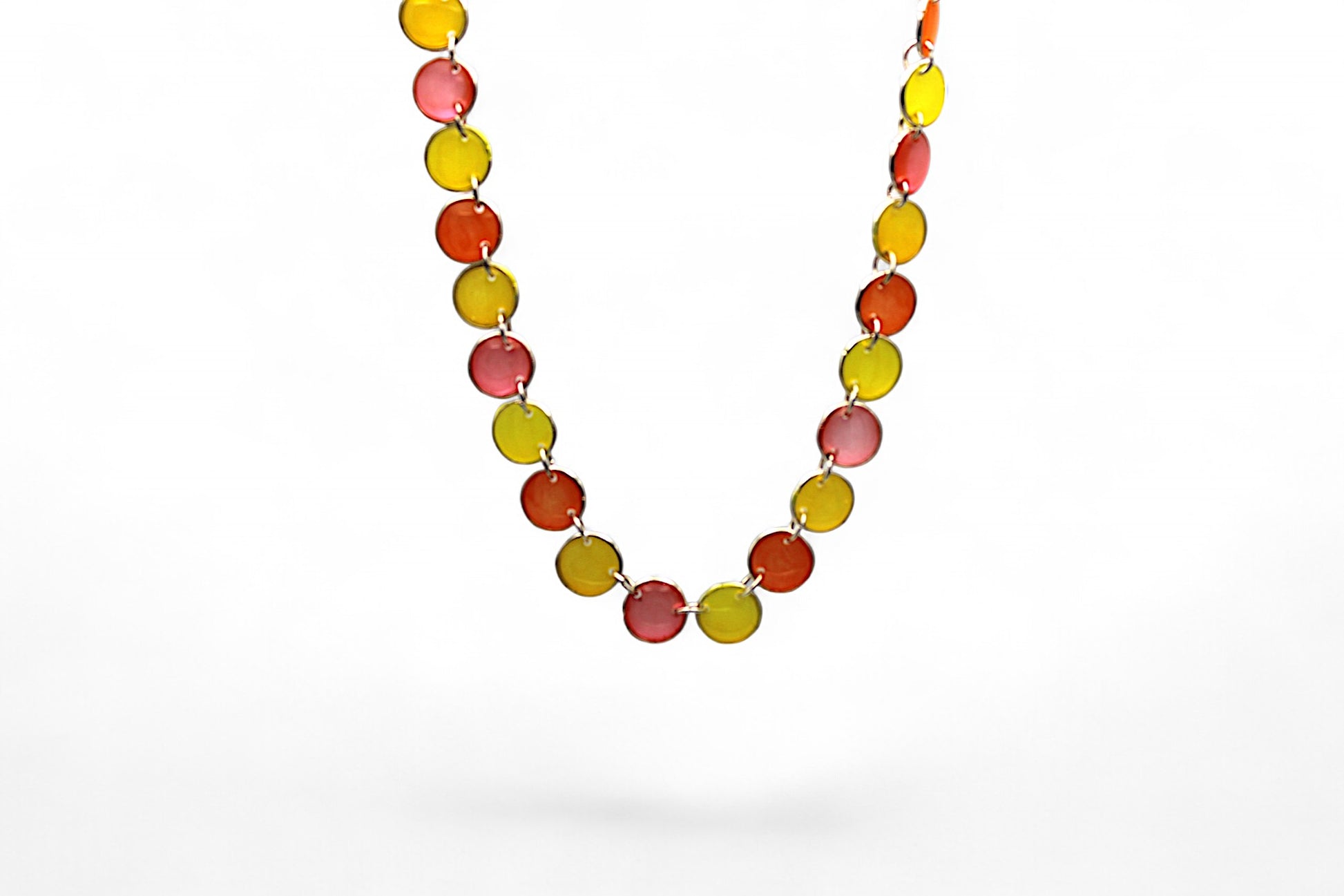 Ajoutez une touche de couleur à votre tenue avec ce magnifique collier en résine. Composé de cercles multicolores, ce bijou est à la fois élégant et moderne, parfait pour toutes les occasions.