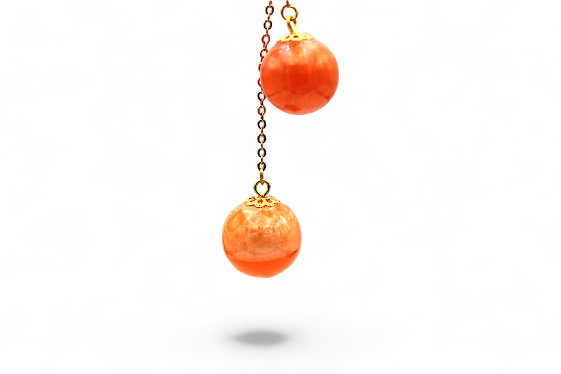 Ce collier en acier inoxydable doré de 56 cm de longueur est orné d'un pendentif original et lumineux. Le pendentif mesure 6,5 cm de longueur et se compose d'une sphère de 1,2 cm de diamètre en résine orange foncé nacré, d'une sphère de 1,2 cm de diamètre en résine orange clair nacré et de résine orange. Il est surmonté d'un anneau doré orné de strass pour apporter une touche d'éclat et de glamour.