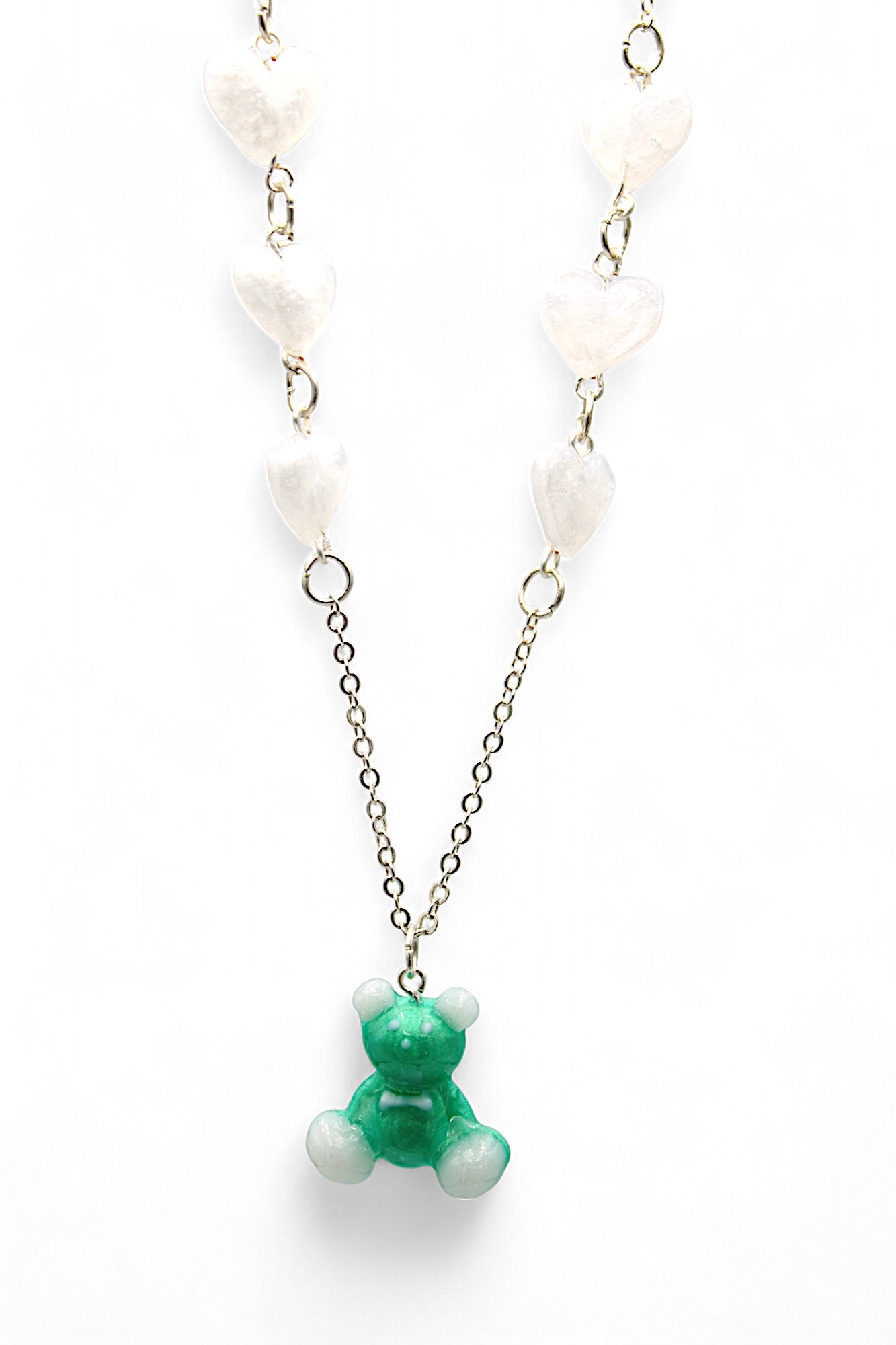 Ce collier en acier inoxydable argenté est le choix parfait pour ajouter une touche ludique à votre look. Son design original avec des oursons verts et blancs ainsi que des cœurs blancs nacrés en résine en fait un accessoire unique et tendance. Achetez le dès maintenant pour seulement 25€.