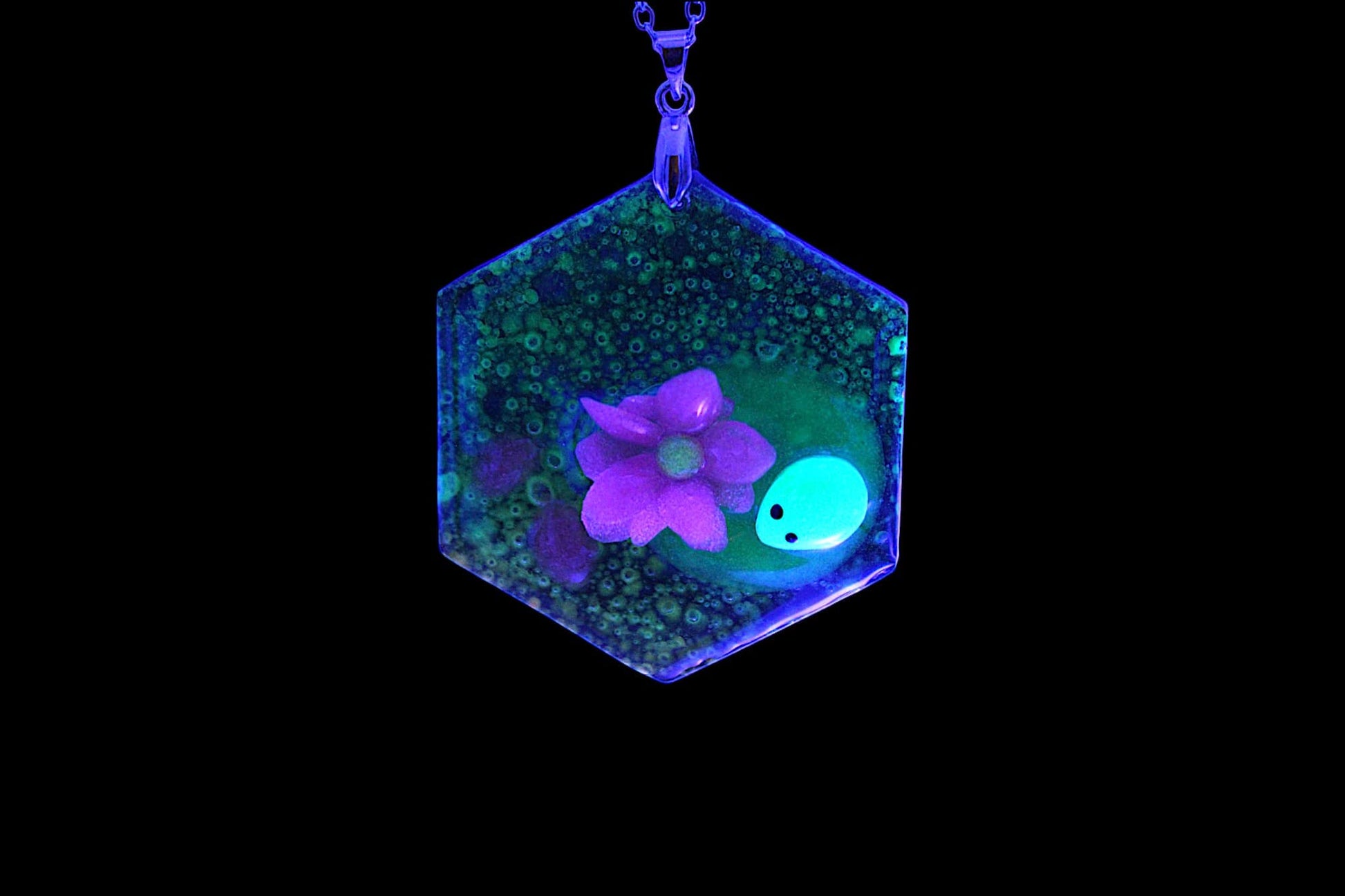 Ce collier en acier inoxydable de 54 cm est orné d'un pendentif hexagonal de 5 cm sur 4,5 cm, réalisé en résine noir et vert fluorescent. Le pendentif représente une grenouille en résine vert fluorescent posée sur un nénuphar en résine vert fluo, avec une fleur de nénuphar en résine violet fluorescent.
