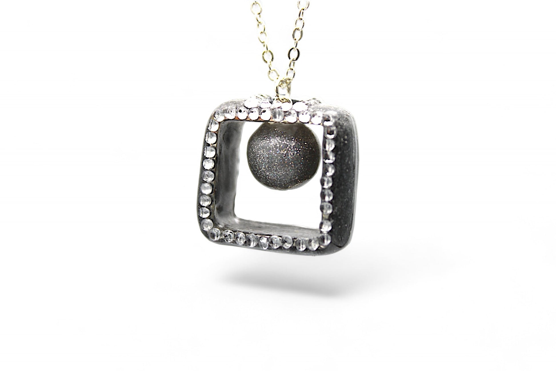 Ce collier en acier inoxydable argenté de 55 cm est orné d'un pendentif en forme de sphère de résine décorée de paillettes argentées. La sphère est dans un cadre de résine gris foncé nacré et est embellie de strass Swarovski.