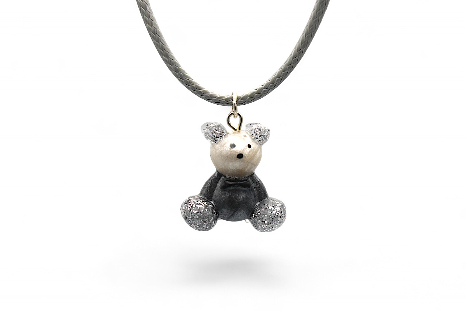 Ce collier cordon gris est doté d'un adorable ourson en résine, de couleur gris, blanc et paillettes argentées, mesurant 2 cm. Sa longueur est ajustable de 44 cm à 50 cm, pour s'adapter parfaitement à votre tour de cou.