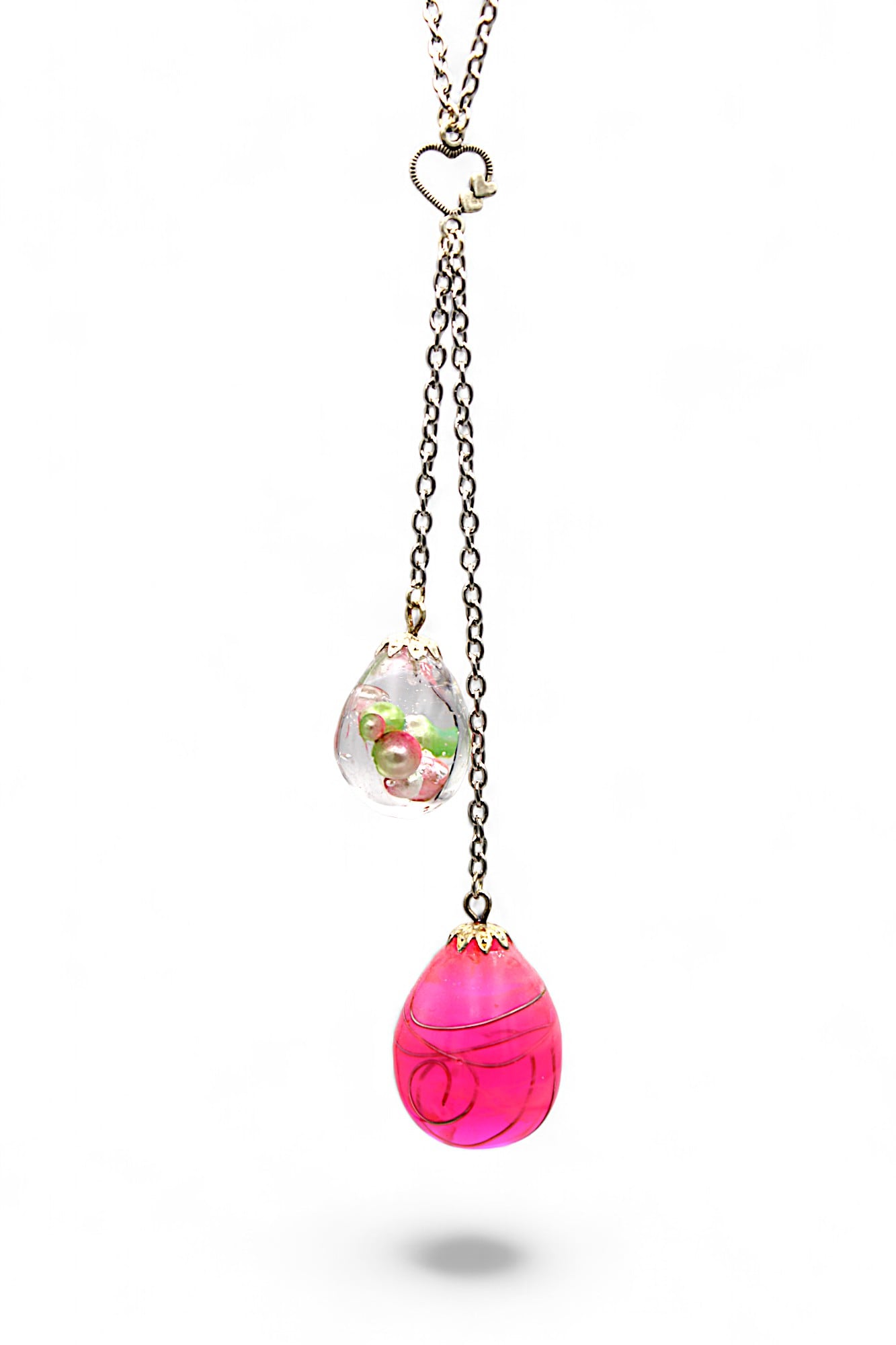 Ce collier élégant et moderne est composé d'une chaîne en acier inoxydable argenté de 58 cm et de deux pendentifs en résine. Le premier pendentif en forme de gland mesure 2 cm sur 1,5 cm et est réalisé en résine rose et fil argenté. Le second pendentif, également en forme de gland, mesure 1,5 cm sur 1 cm et est en résine transparente incrusté de perles roses, vertes et blanches. Les deux pendentifs sont surmontés d'une breloque cœur argenté.