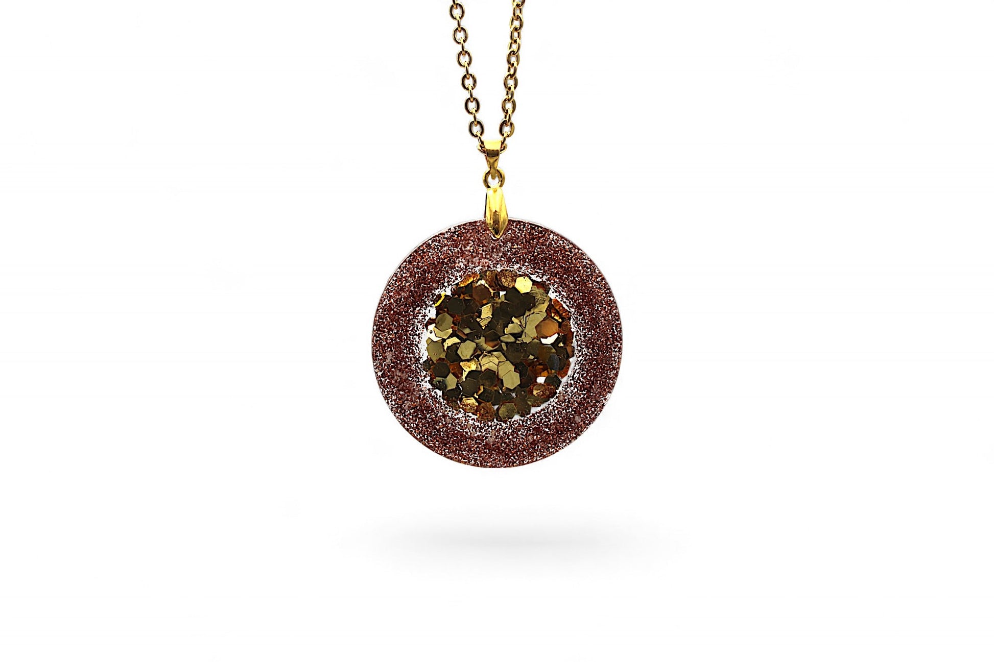 Ce collier en acier inoxydable doré de 56 cm est orné d'un pendentif en forme de cercle de 4 cm de diamètre. Ce dernier est réalisé en résine transparente avec des paillettes marron et en son centre se trouve un cercle de résine transparente avec des paillettes dorées.