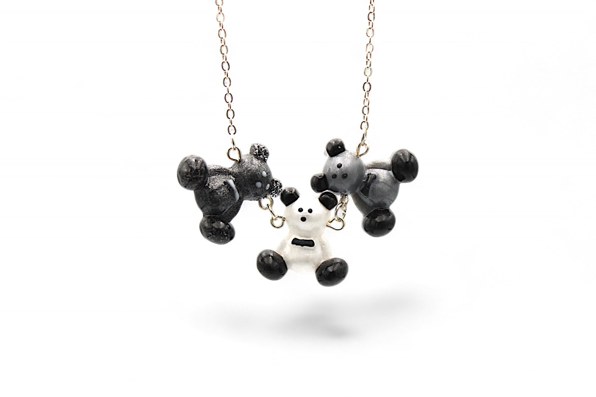 Ce collier élégant et original est composé d'une chaîne en acier inoxydable argenté d'une longueur d'environ 55 cm, agrémentée de trois adorables oursons de 2 cm en résine de couleur gris, blanc et noir.