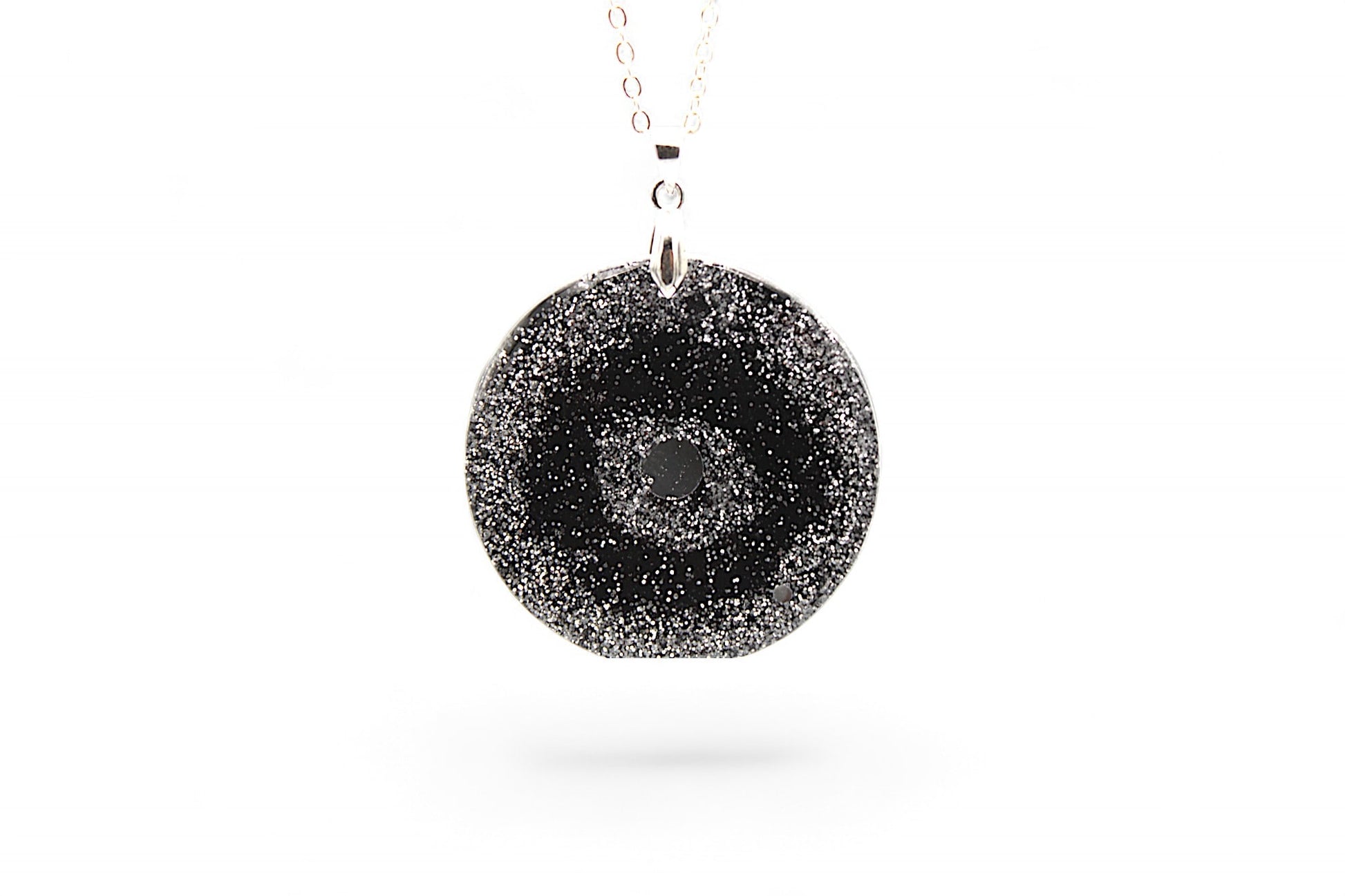 Collier en acier inoxydable argenté de 56 cm de longueur, avec un pendentif cercle de 4 cm de diamètre. Le pendentif est composé de résine noire et paillettes argentées, avec un cercle effet miroir au centre, donnant un effet galaxie unique.