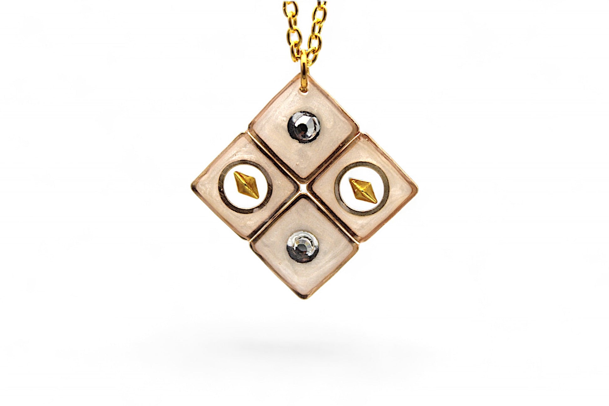 Ce collier en acier inoxydable doré est composé de carrés en résine blanche nacré avec des strass ou un insert doré en son centre. Le pendentif mesure 2,5 sur 2,5 cm et est constitué de 4 autres de ces carrés assemblés. La chaîne mesure 60 cm de longueur et les carrés ont une dimension de 1,25 sur 1,25 cm.