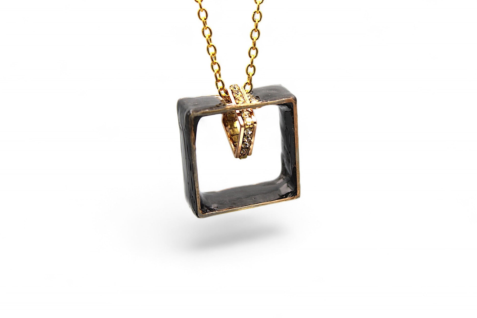Ce collier élégant et sophistiqué est composé d'un pendentif carré en résine noir incrusté de strass Swarovski. Le pendentif mesure 4cm de long et est suspendu à une chaîne en acier inoxydable doré de 60cm de longueur par un autre carré de 1 cm sur 1 cm en strass Swarovski