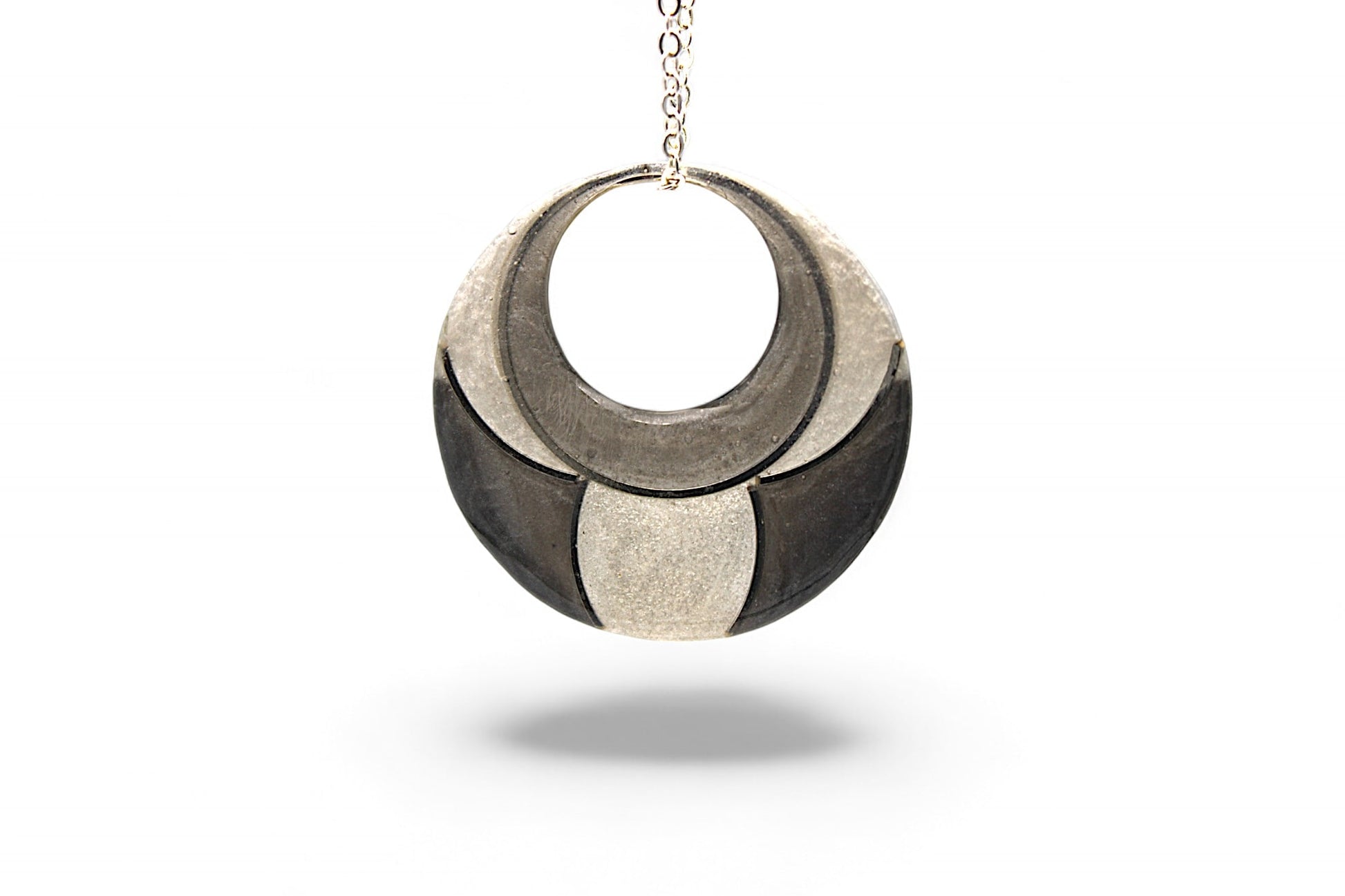 Ce collier élégant et moderne est composé d'un pendentif de 4 cm de diamètre en acier inoxydable argenté, avec des formes géométriques en résine gris clair nacré, gris foncé nacré et blanc nacré. Le collier mesure 56 cm de long et est parfait pour apporter une touche sophistiquée à toutes vos tenues.