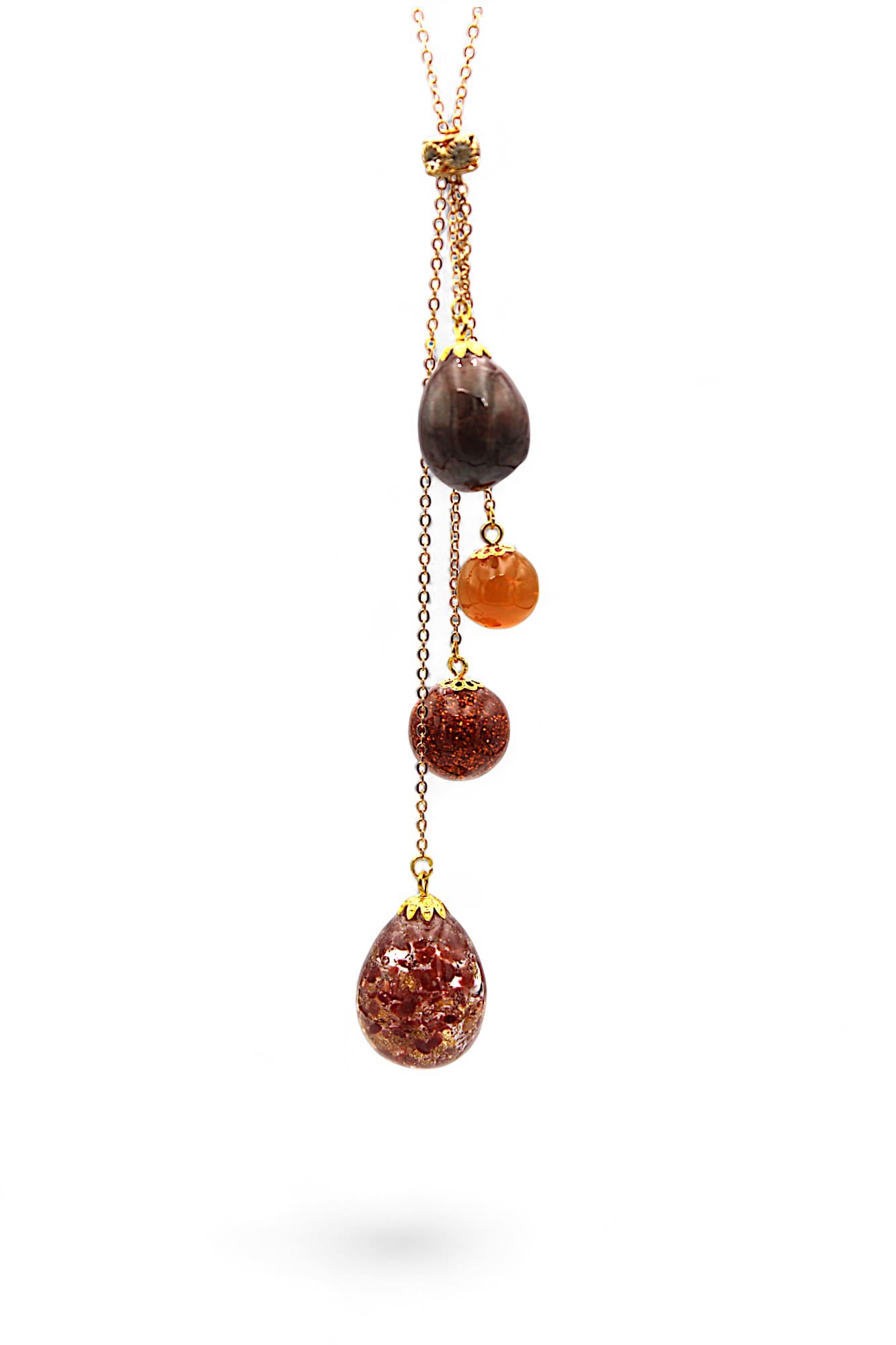 Ce collier en acier inoxydable doré de 56 cm de long est orné d'un pendentif original et élégant. Le pendentif mesure 13,5 cm de long et est composé d'un gland en résine marron nacré, d'une sphère en résine caramel, d'une sphère en résine transparente avec des paillettes orange et d'un gland en résine transparente avec des billes de résine marron et doré.