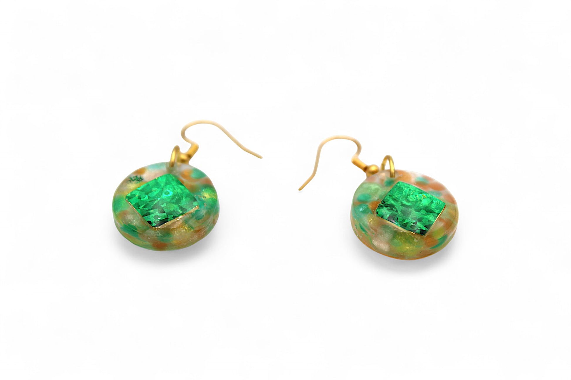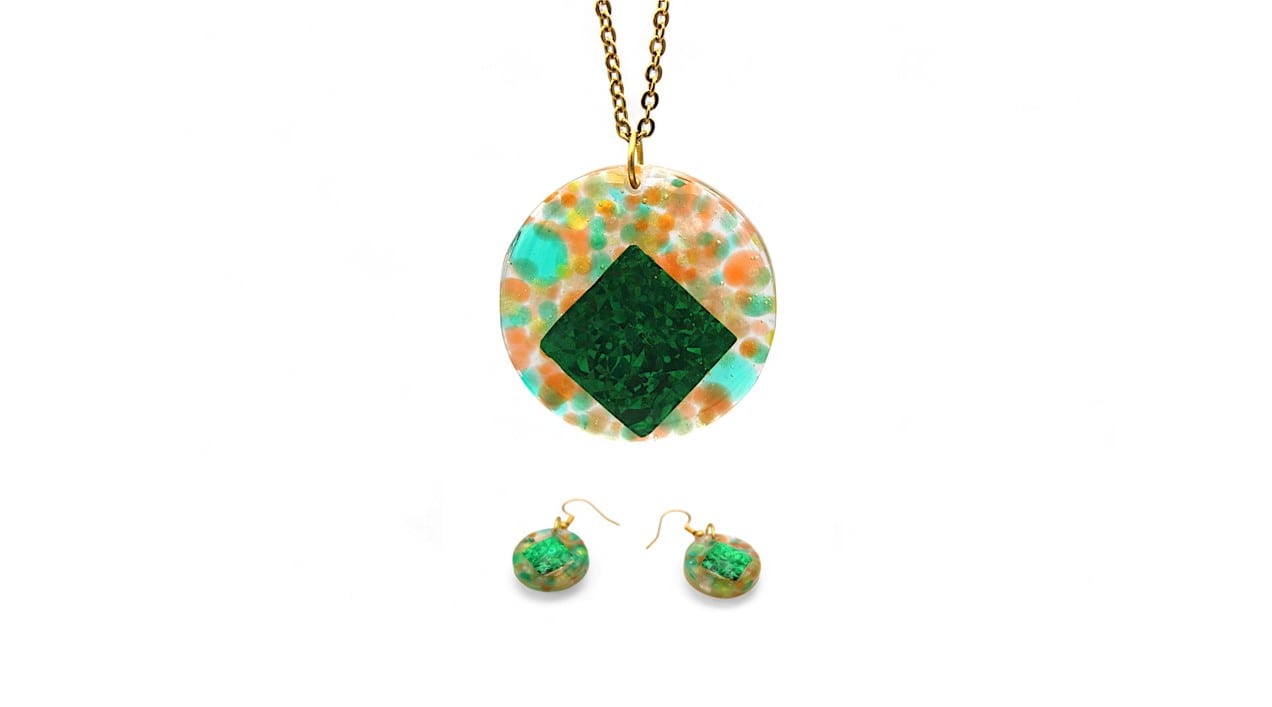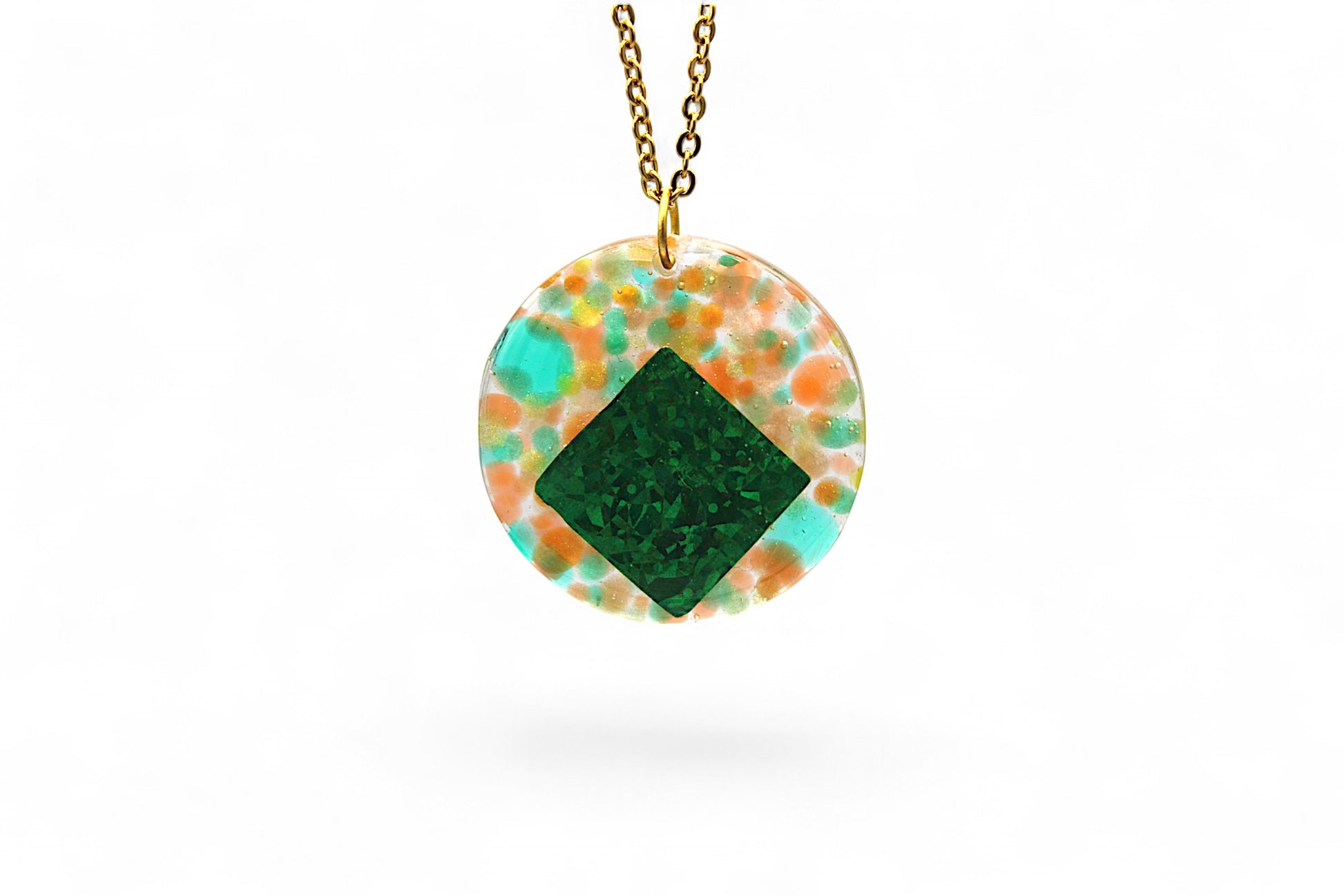 Détails : Cercles de 2 cm de diamètre en résine transparente, billes de résine verte, jaune et orange, carré en papier holographique vert