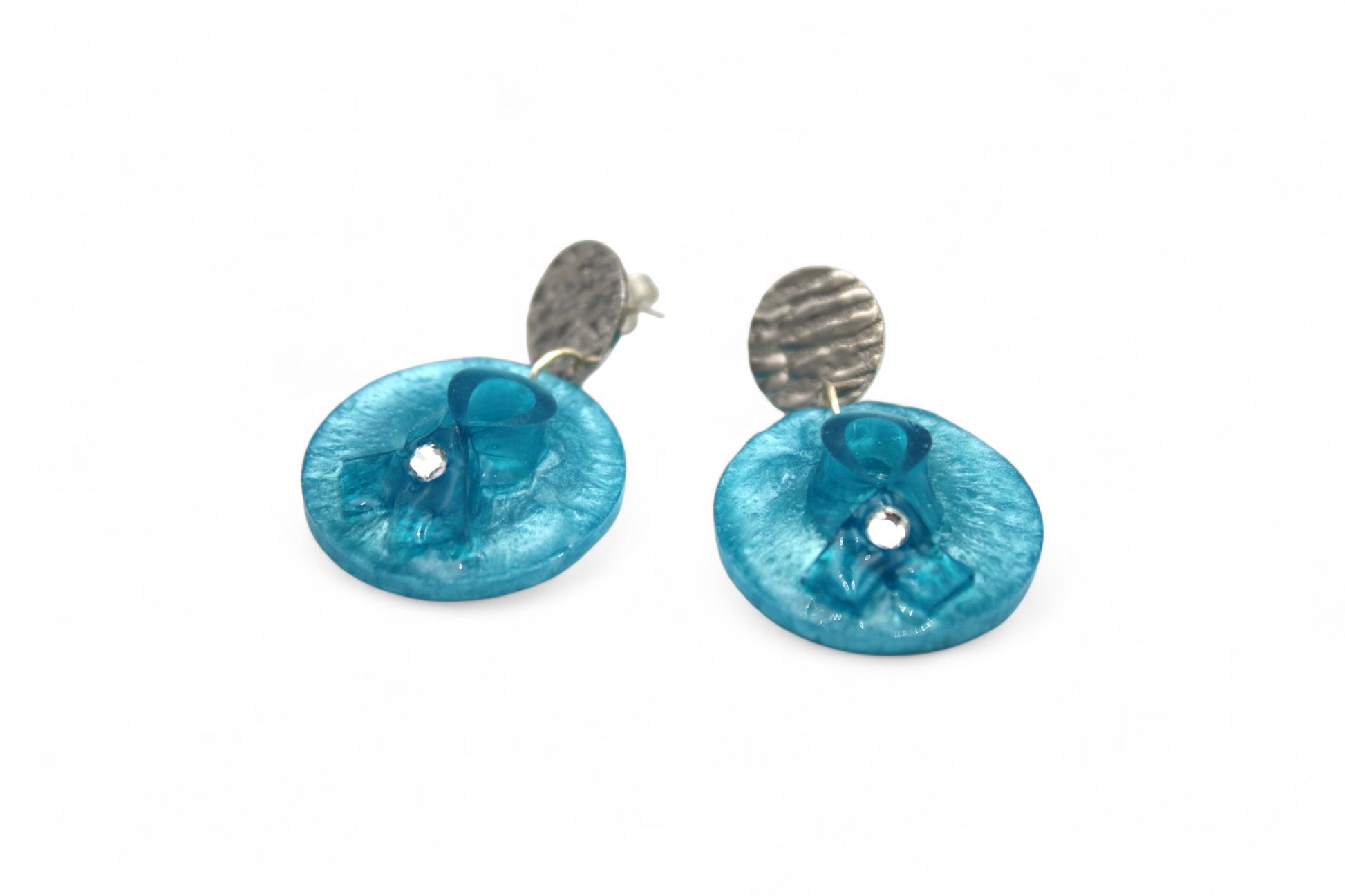 Clous d'oreilles : Pendants de 4,5 cm de long, cercles de 3 cm de diamètre en résine bleu nacré