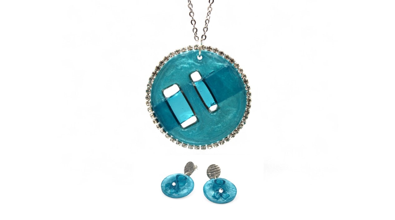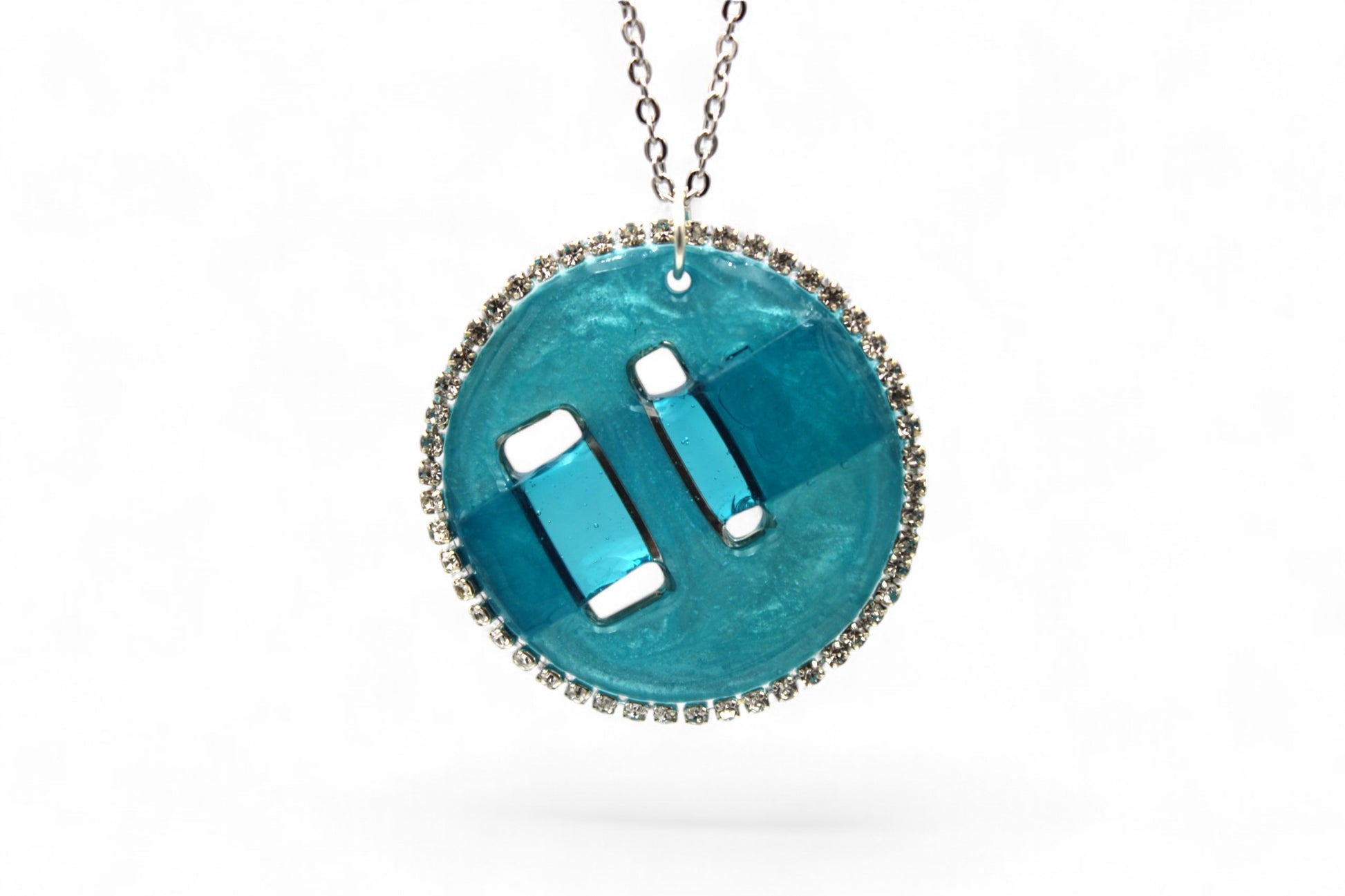 Pendentif : Cerceau de résine bleu nacré avec bande de résine bleue centrale, entouré de strass scintillants