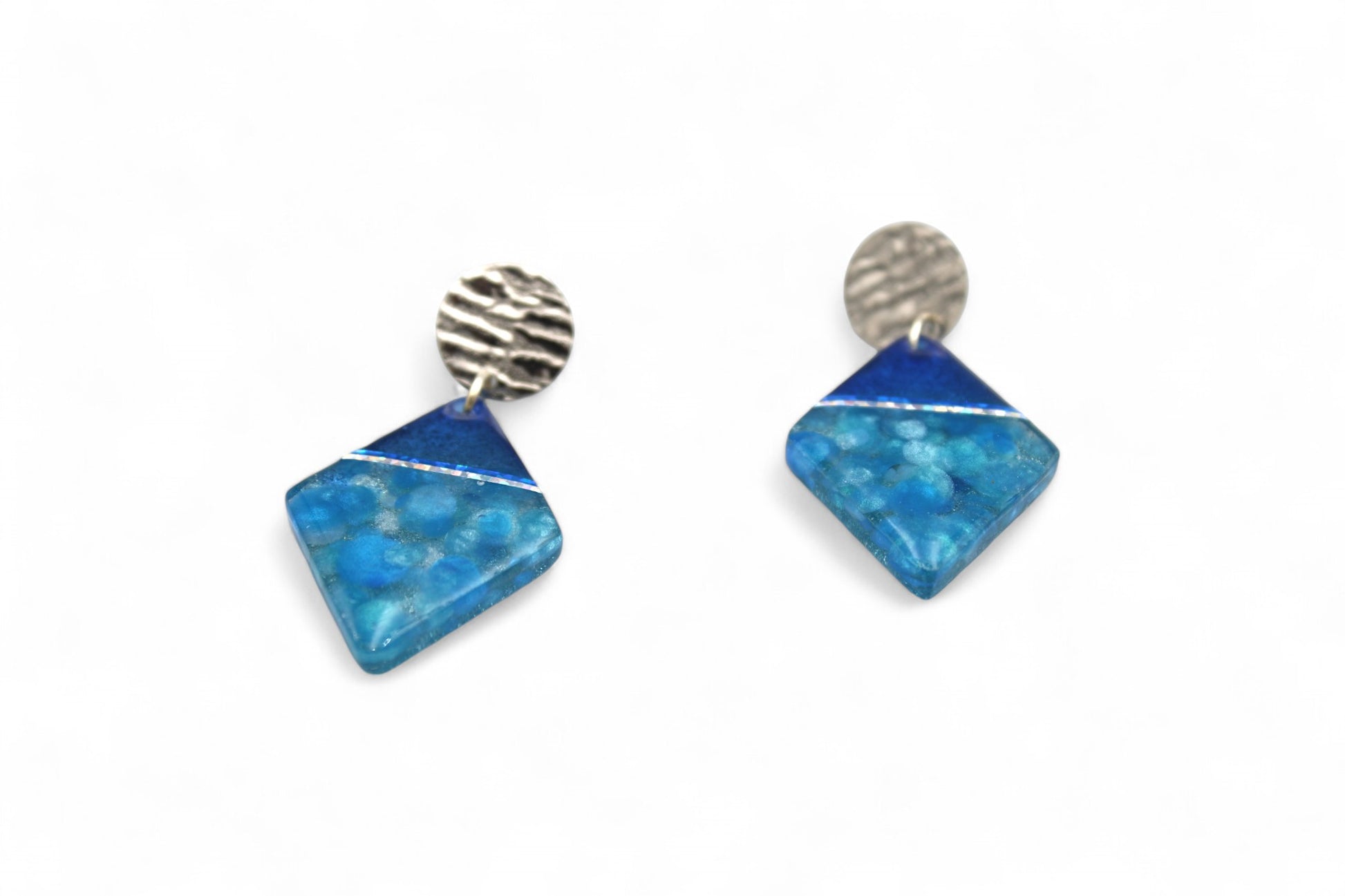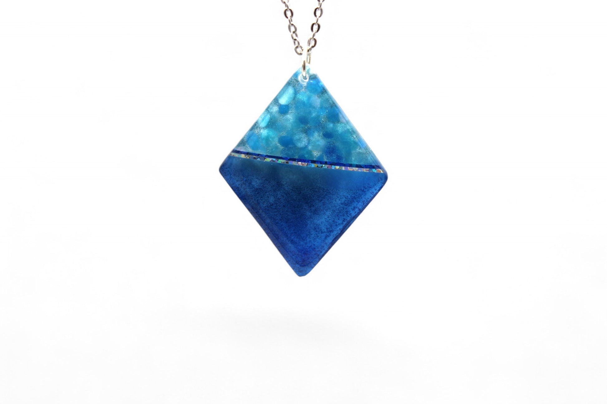Design : moitié en résine bleu nacré, moitié en résine avec bulles dans les tons bleus, séparées par une ligne argentée