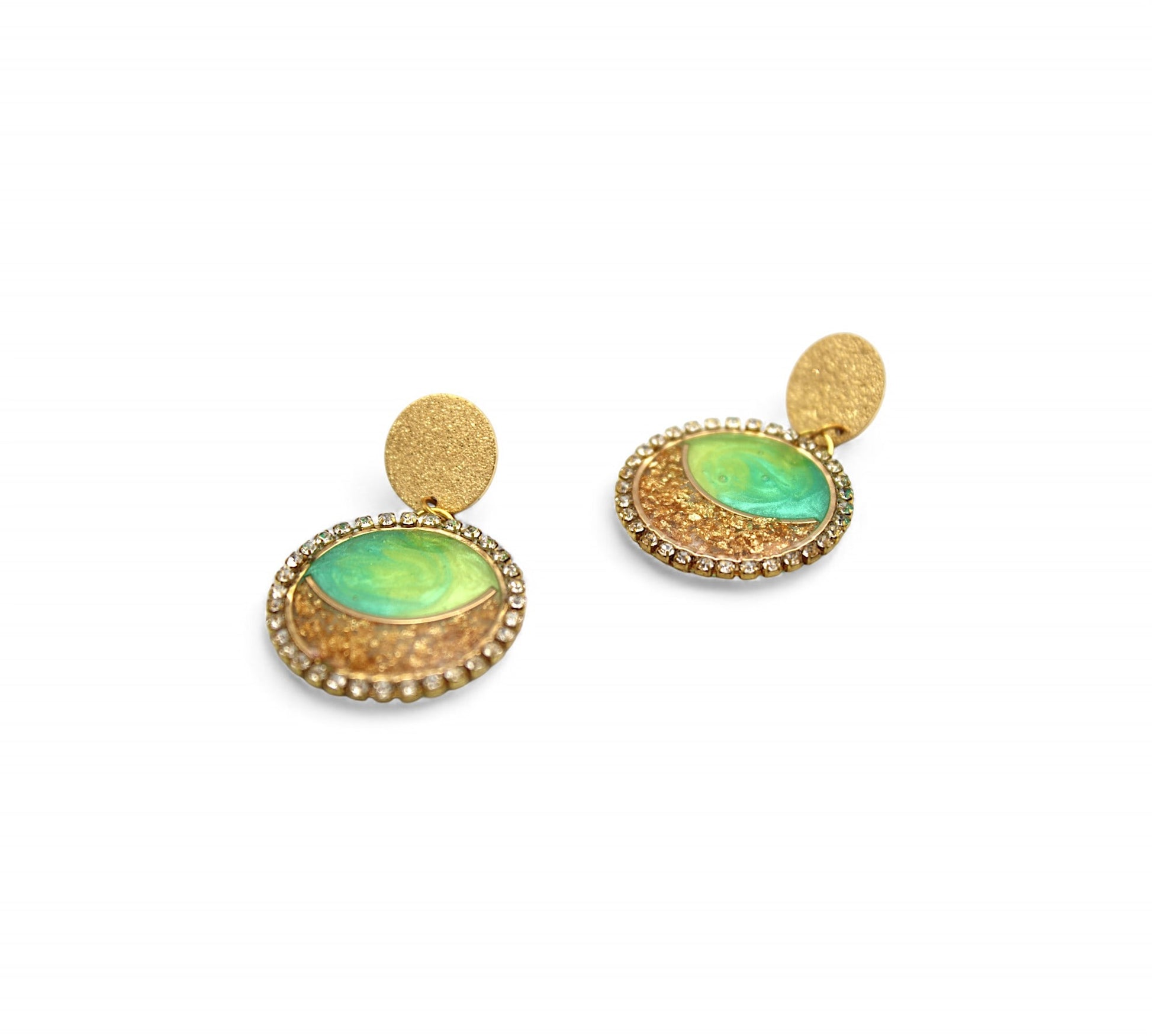 Cercle : 3 cm de diamètre en résine verte et jaune avec feuilles d'or, entouré de strass
