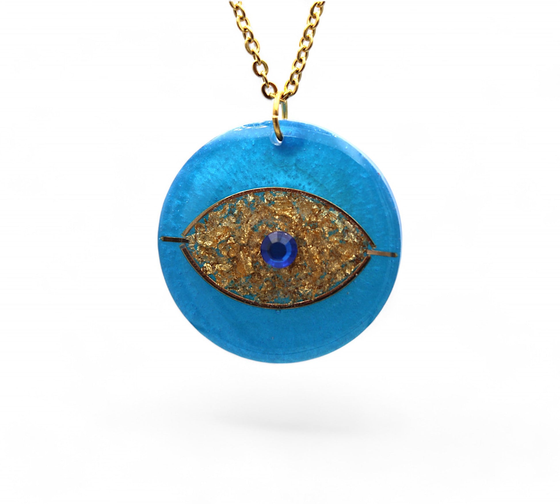 Matière du pendentif : Résine bleu nacré, feuilles d'or et strass bleu