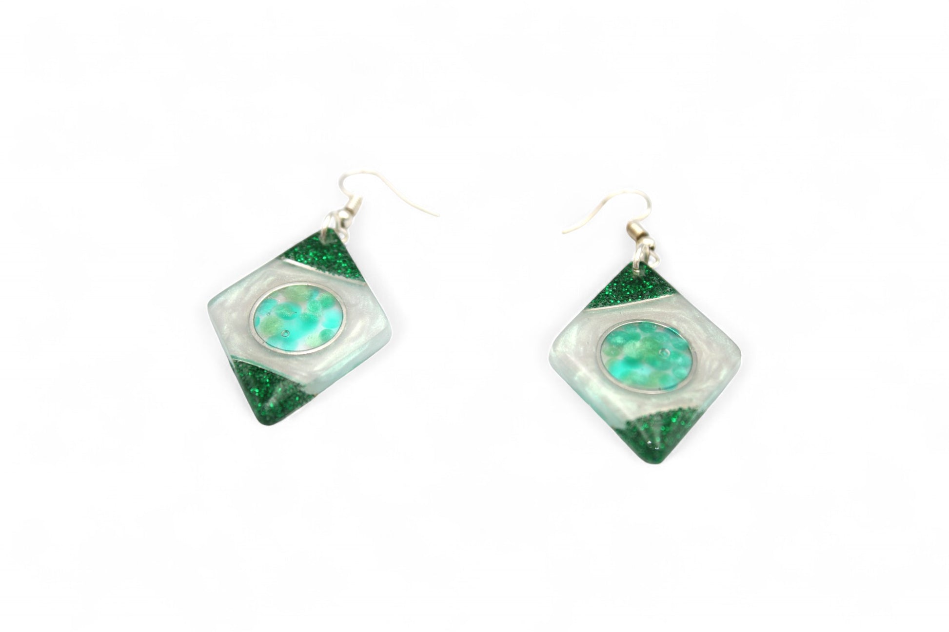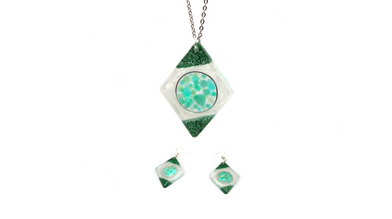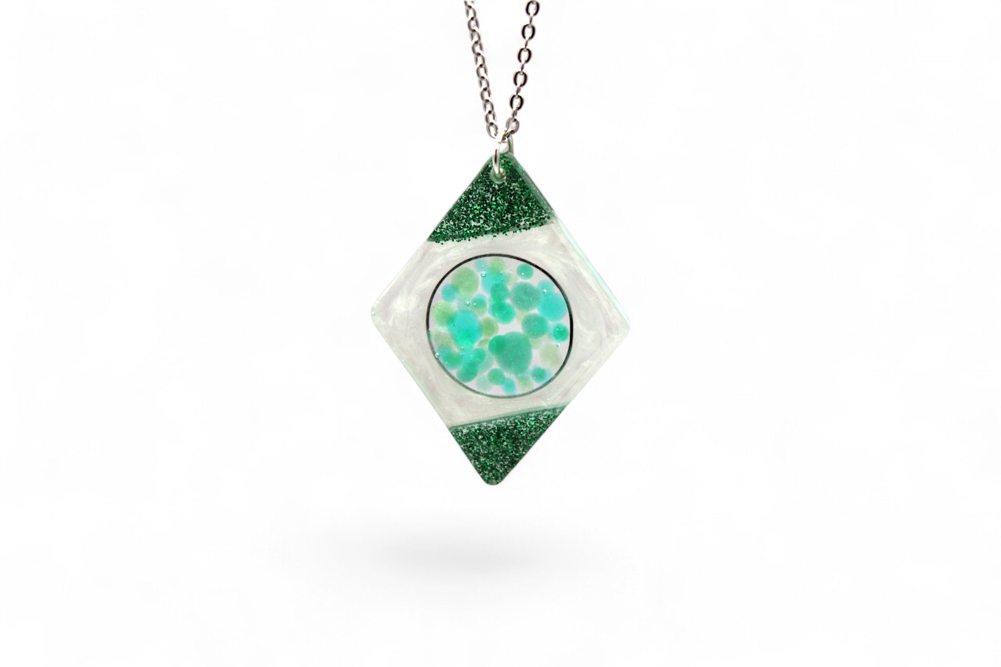 Design : Losange et cercle avec bulles de résine dans les tons verts
