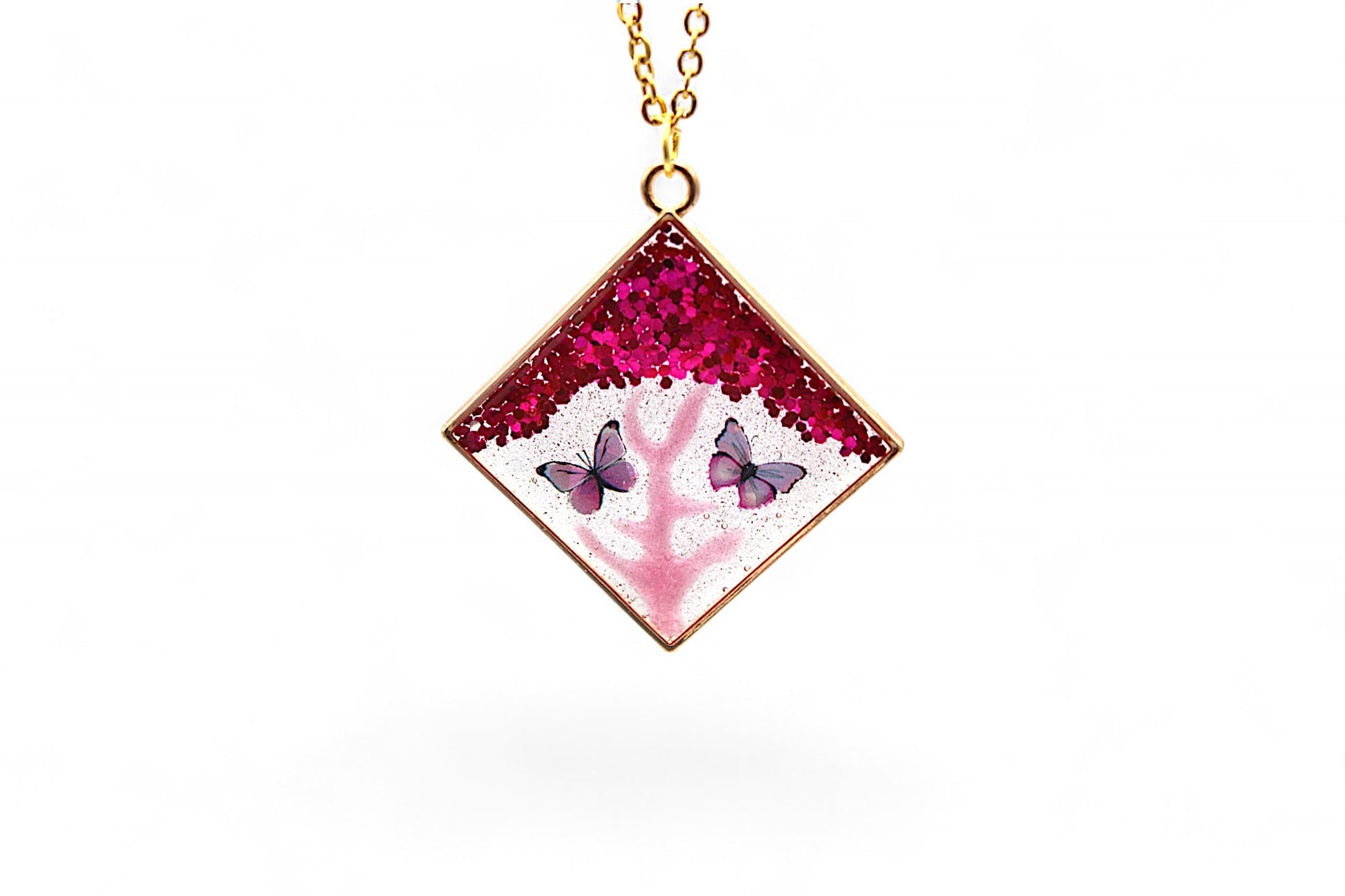 Détails du Pendentif : Résine transparente avec paillettes roses et stickers papillons