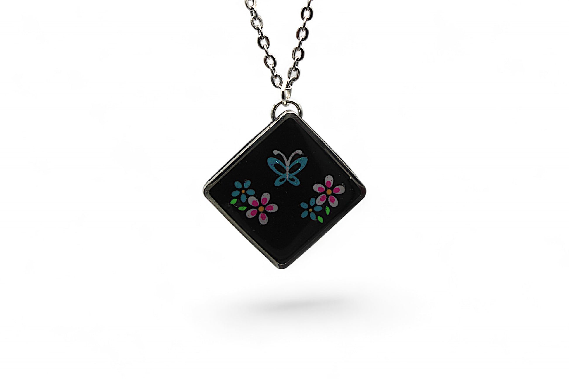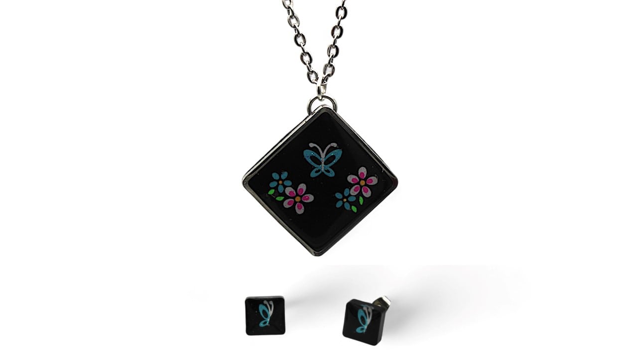 Cette parure de bijoux se compose d'un collier en acier inoxydable argenté de 42 cm avec un pendentif carré de 2x2 cm orné de stickers fleurs et papillons dans les tons bleus sur fond de résine noire, ainsi que de boucles d'oreilles assorties avec des clous carrés de 0,9x0,9 cm également ornés de stickers papillon bleu sur fond de résine noire.