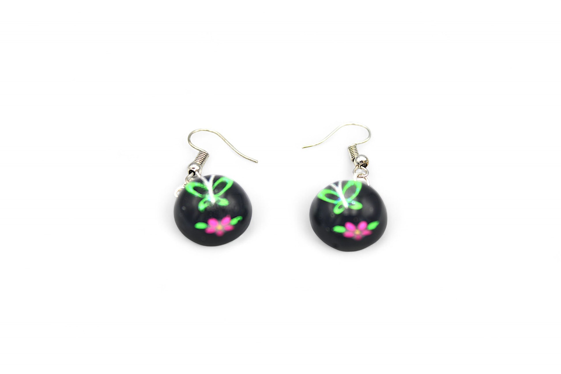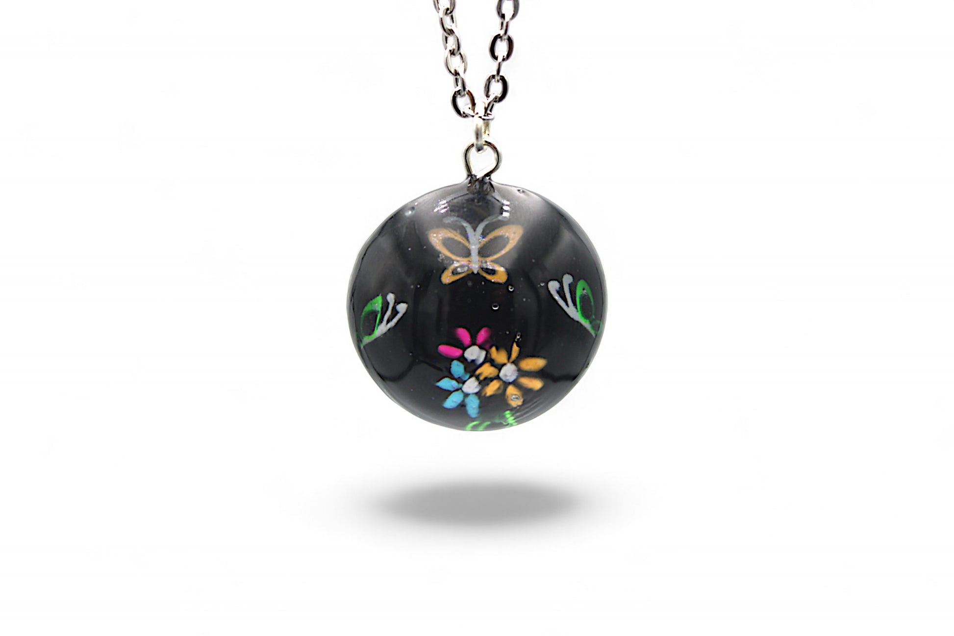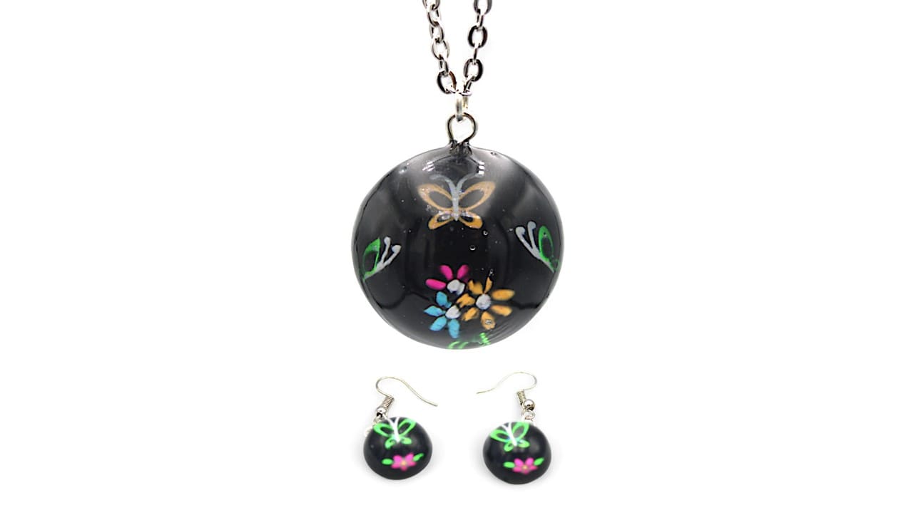 Parure comprenant un collier et une paire de boucles d'oreilles en acier inoxydable argenté ornés de stickers fleurs et papillons dans les tons vert et orange sur fond de résine noire.