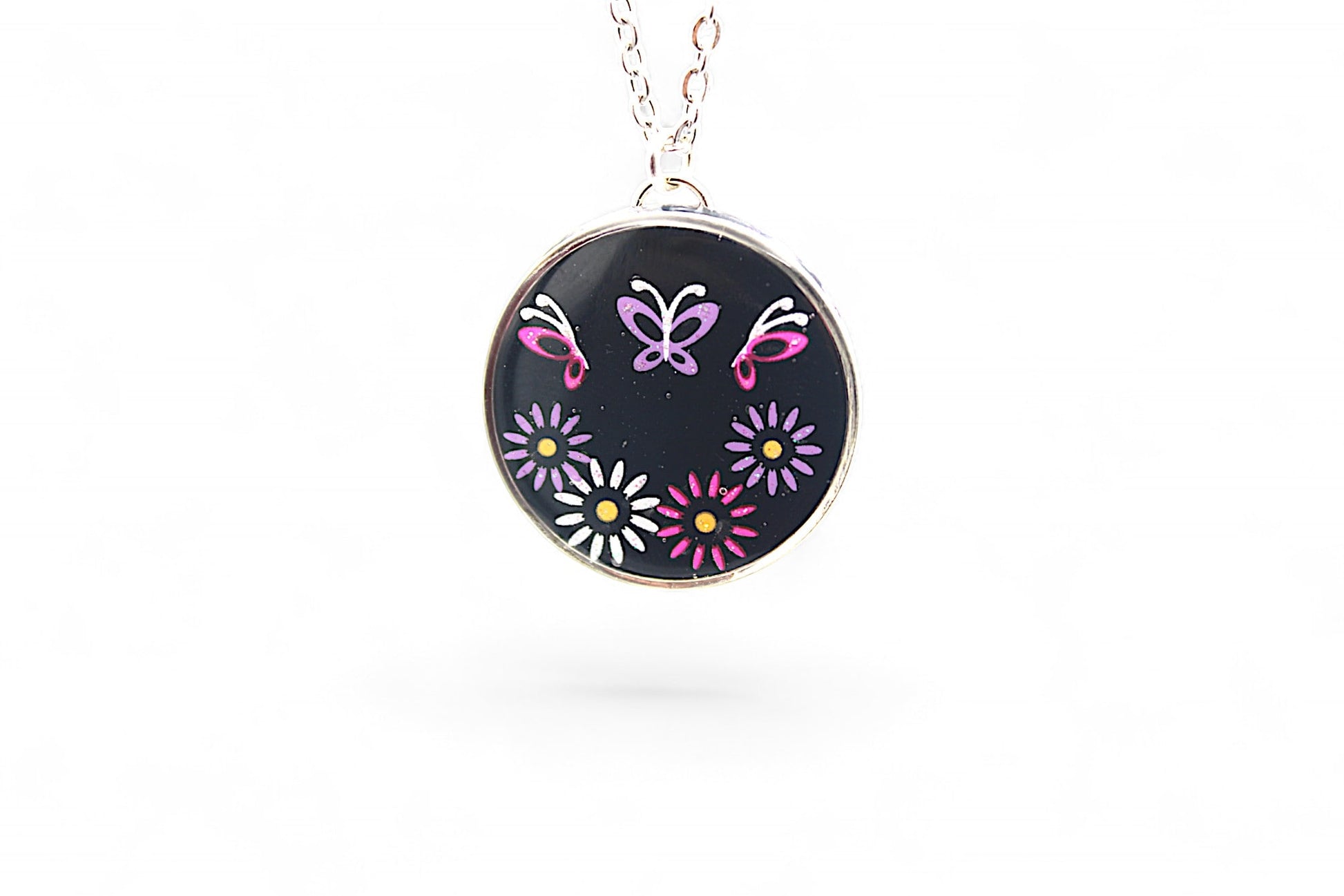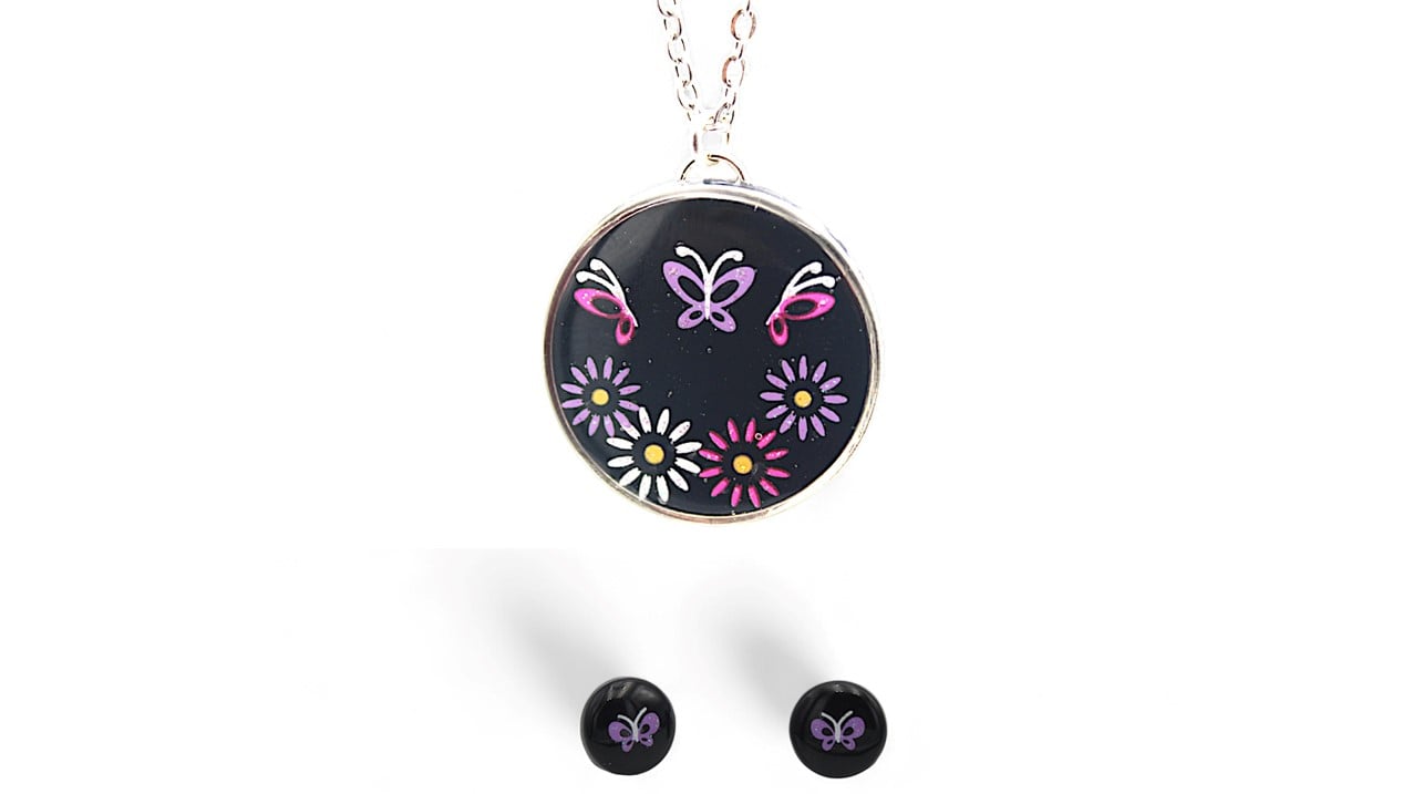 Cette parure élégante se compose d'un collier en acier inoxydable argenté de 42 cm avec un cercle d'un diamètre de 2,5 cm orné de stickers fleurs et papillons dans les tons roses et violets sur un fond de résine noire. Les boucles d'oreilles assorties sont également en acier inoxydable argenté avec des clous en forme de cercle d'un diamètre de 1 cm, agrémentés de stickers papillon violet sur fond de résine noire.