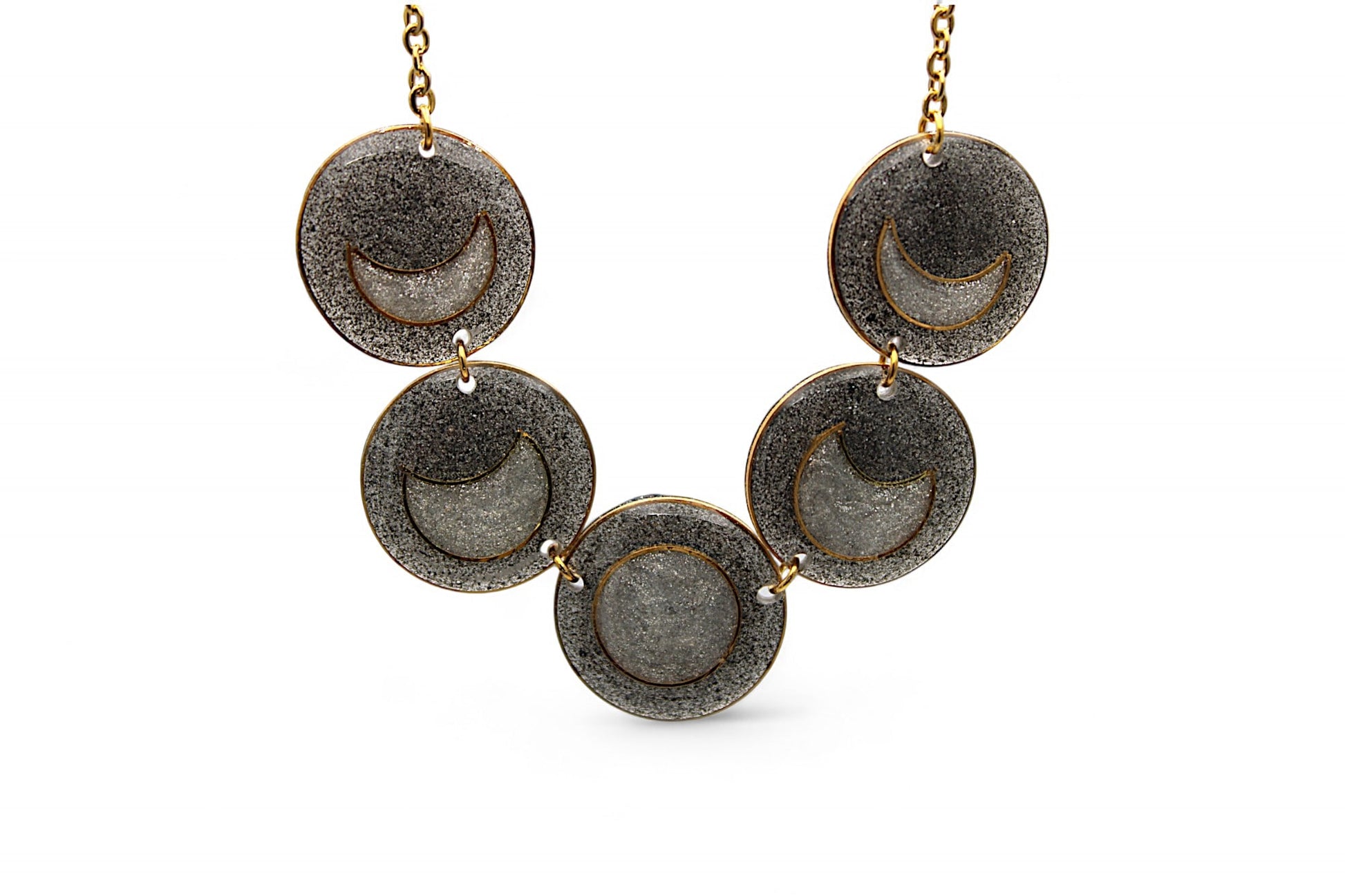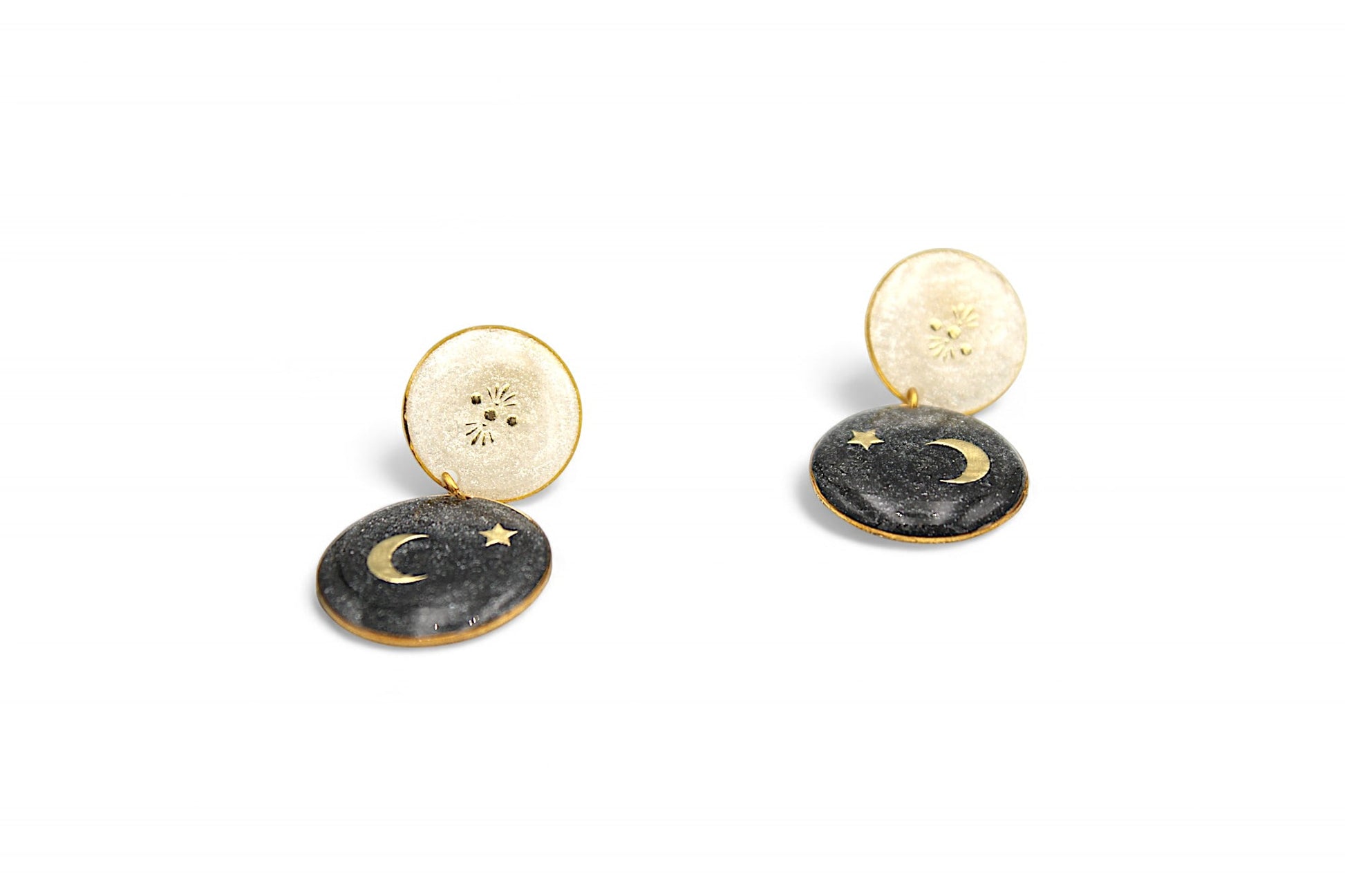 Cette élégante parure de bijoux en acier inoxydable doré est ornée de motifs lunaires et étoilés pour un look mystique et sophistiqué. Le collier de 48 cm est paré de cercles de 2 cm de diamètre en résine noir nacré et d'une lune blanche nacrée représentant le cycle lunaire. Les clous d'oreilles pendants de 4,3 cm se composent d'un cercle de 1,8 cm de diamètre en résine blanc nacré et stickers doré, ainsi que d'un cercle de 2,2 cm de diamètre en résine noir nacré et stickers dorés lune et étoile.