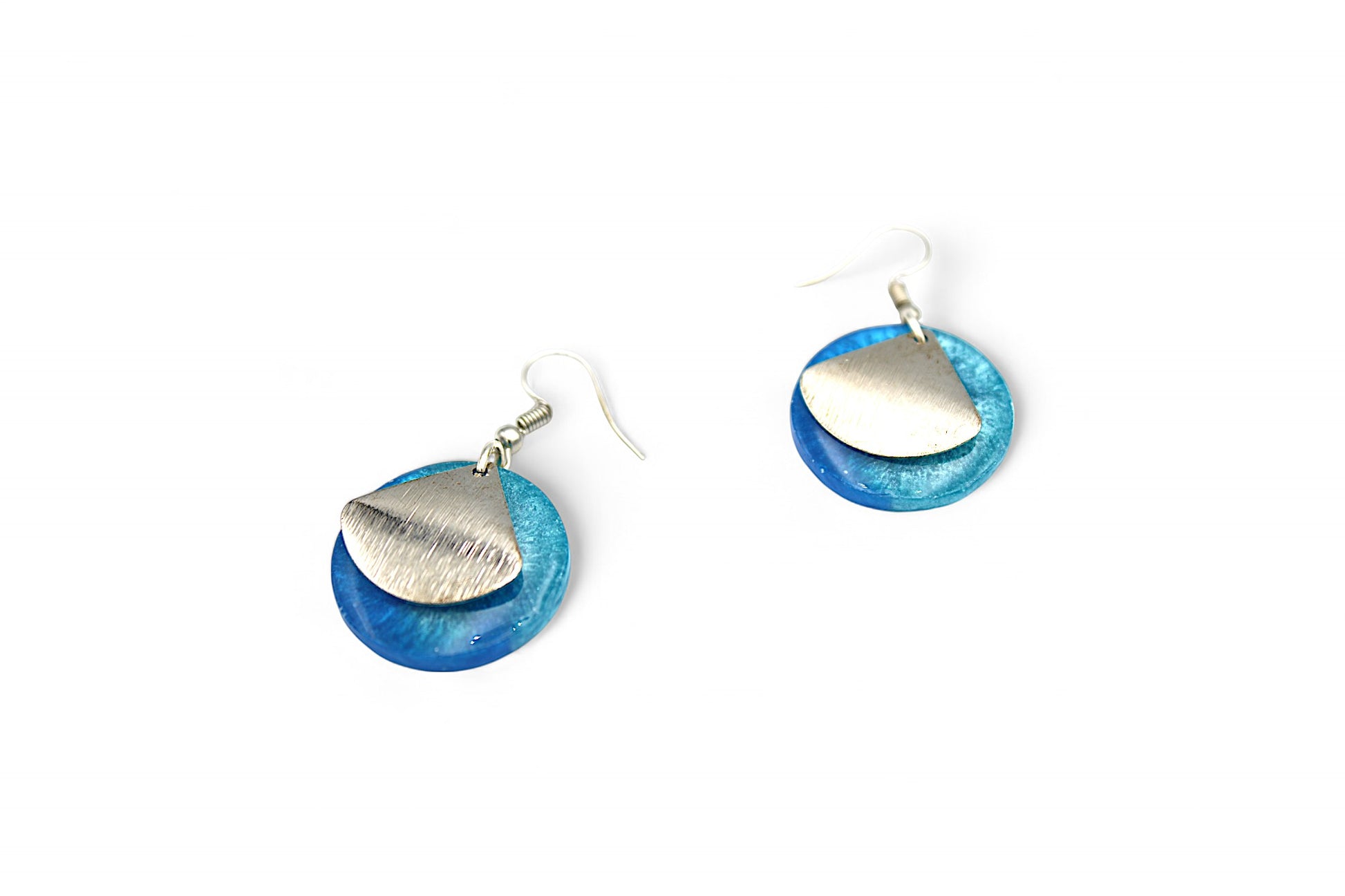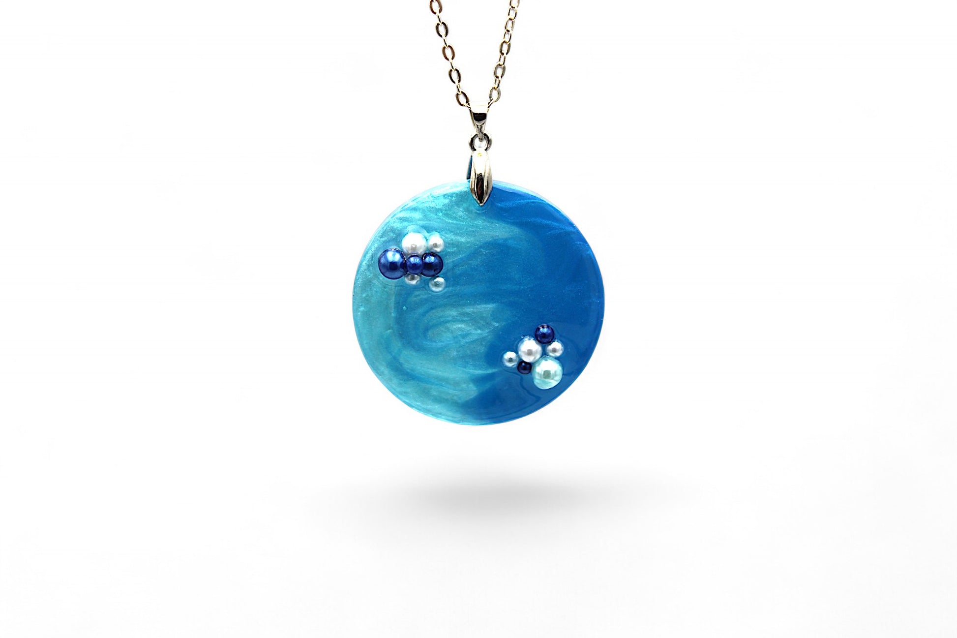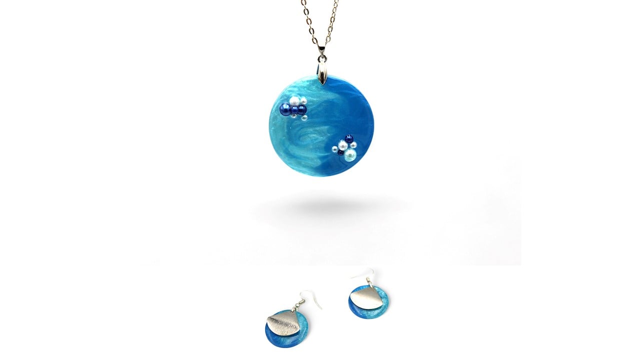 Cette parure 2 pièces en acier inoxydable argenté est composée d'un collier de 52 cm orné d'un pendentif cercle de 4 cm de diamètre en résine bleu clair nacré et bleu foncé nacré, et décoré de perles bleues et blanches. Les boucles d'oreilles pendantes de 4,5 cm sont ornées d'un cercle de 2,5 cm de diamètre en résine bleu clair nacré et bleu foncé nacré, et décorées de breloques argentées en triangle.