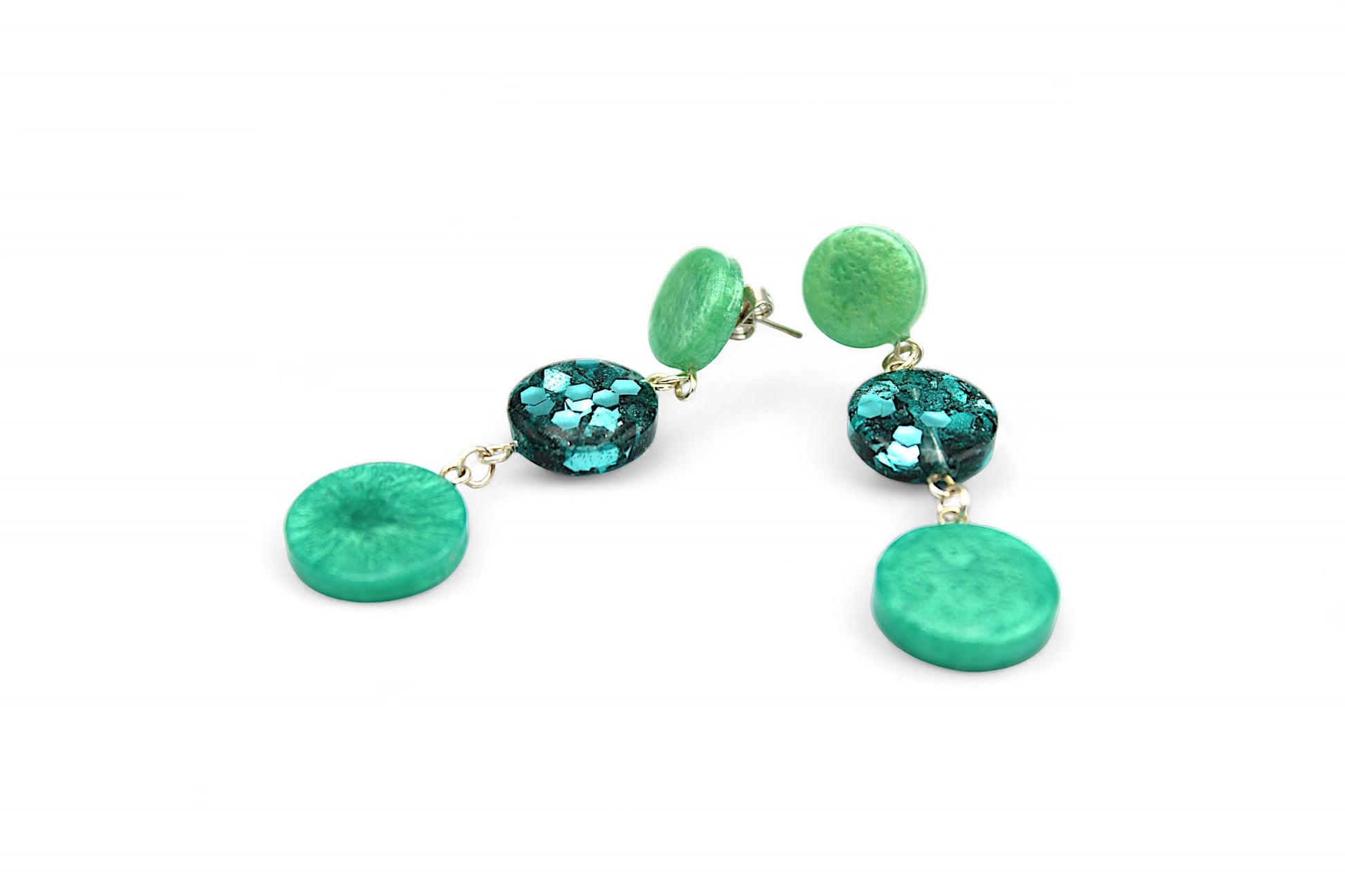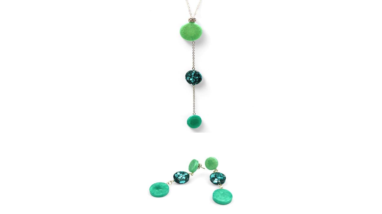 Cette parure en acier inoxydable argenté est composée d'un collier ajustable de 42 à 45 cm et de clous d'oreilles pendants de 6,6 cm de long. Le pendentif du collier, de 14,5 cm de long, est composé de 3 cercles en résine vert nacré, résine et paillettes vertes, et résine vert foncé nacré, surmontés d'un anneau argenté décoré de strass. Les clous d'oreilles pendants sont également composés de 3 cercles en résine vert nacré, résine avec paillettes vertes et résine vert foncé nacré.