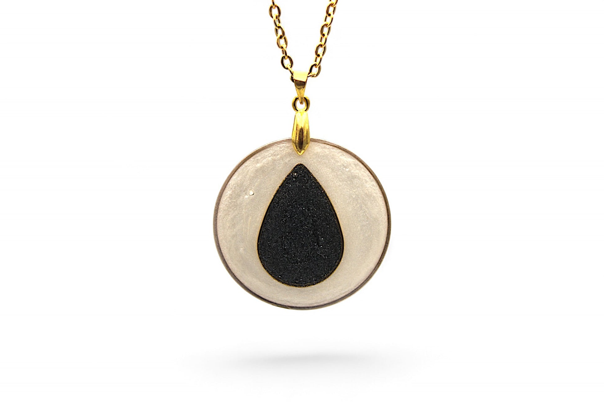 Optez pour cette élégante parure 2 pièces en acier inoxydable doré, composée d'un collier et de boucles d'oreilles assorties. Le collier mesure 56 cm de longueur et est orné d'un pendentif cercle de 3,5 cm de diamètre en résine blanc nacré, avec un insert goutte d'eau en résine noir nacré,. Les boucles d'oreilles sont des clous d'oreilles cercle de 2 cm de diamètre en résine blanc nacré, avec un insert goutte d'eau en résine noir nacré.