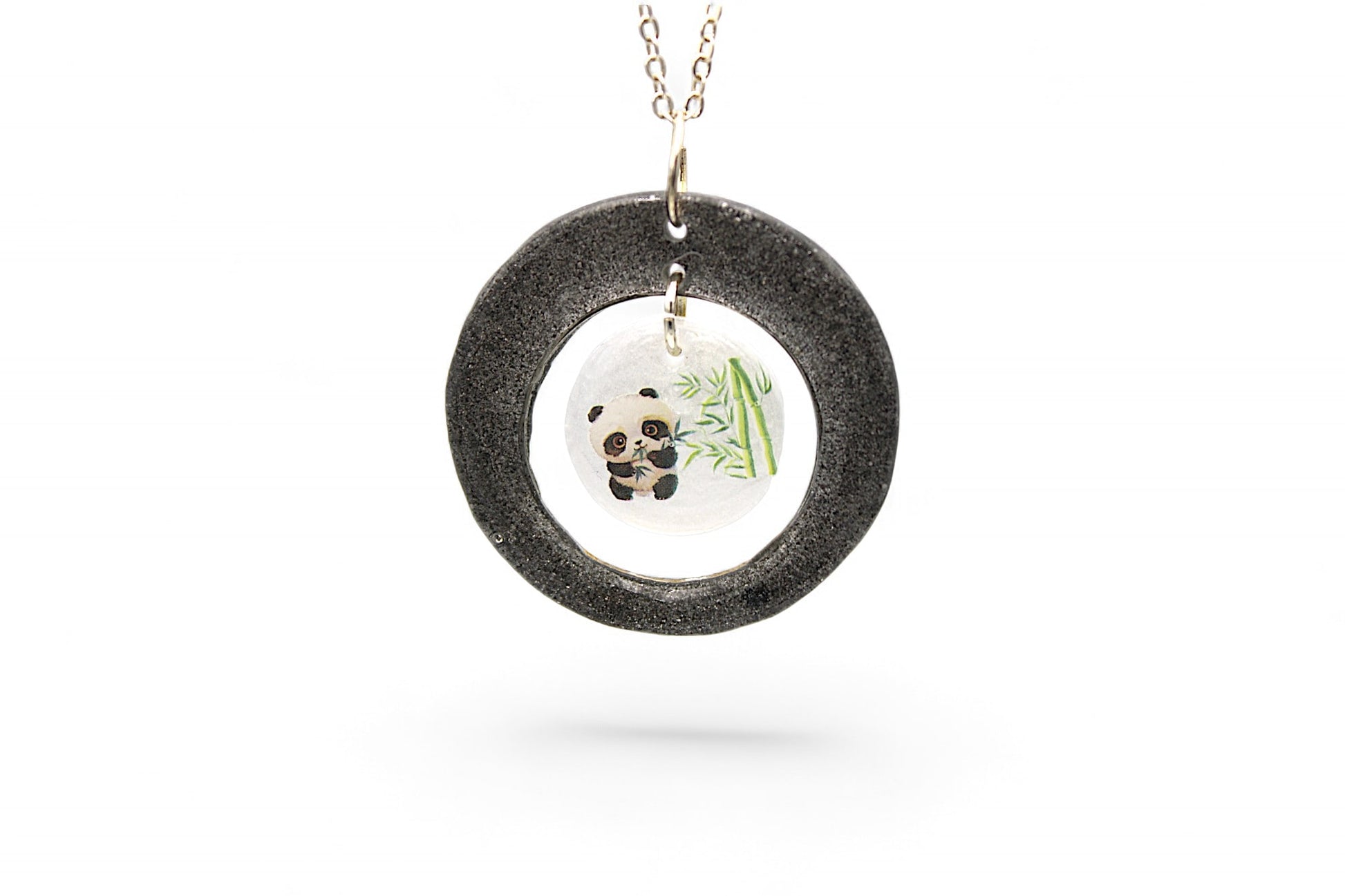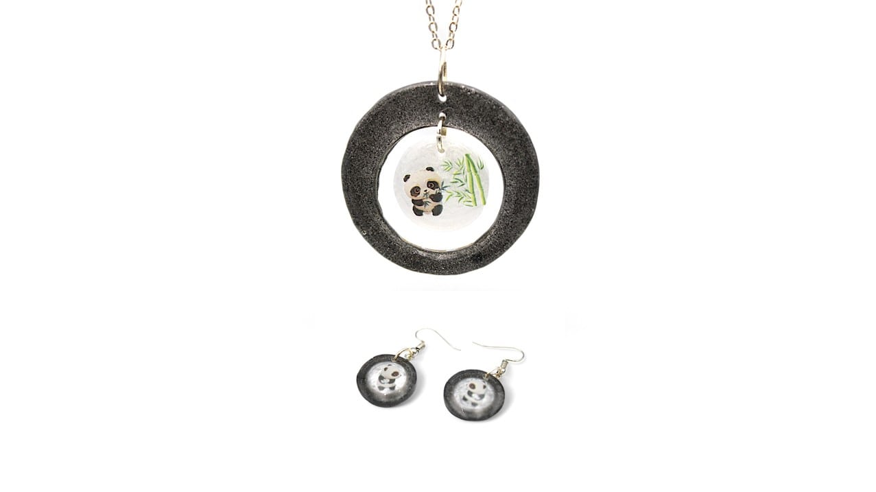 Cette parure 2 pièces en acier inoxydable argenté est composée d'un collier mesurant 60 cm et de pendants d'oreilles mesurant 4 cm. Les pièces sont confectionnées de cercles en résine blanche avec des stickers panda dans un cercle de résine noir nacré.